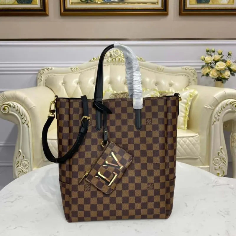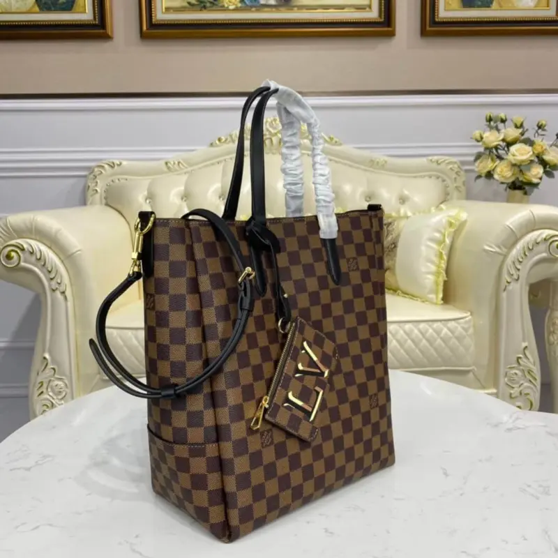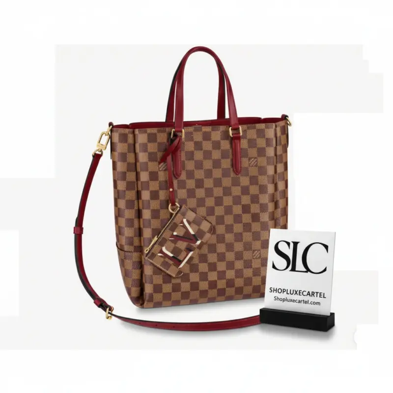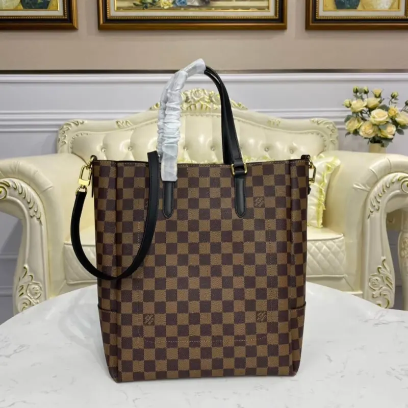 This sleek and modern tote bag offers a sophisticated update to the classic work-to-weekend silhouette. Inspired by vintage 1960s designs, this bag is crafted from a durable coated canvas featuring a timeless checkerboard pattern, elegantly accented with colored leather trim and a matching bonded lining.
