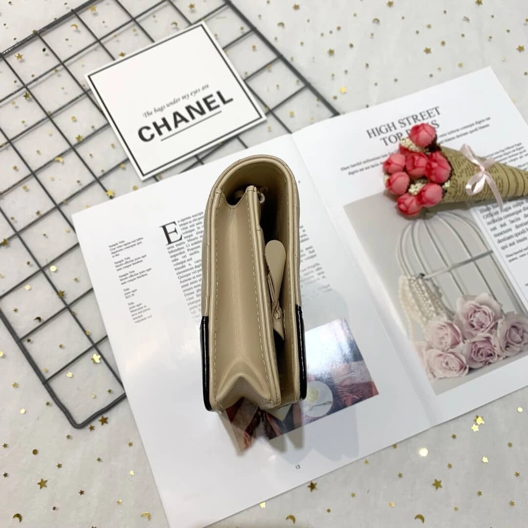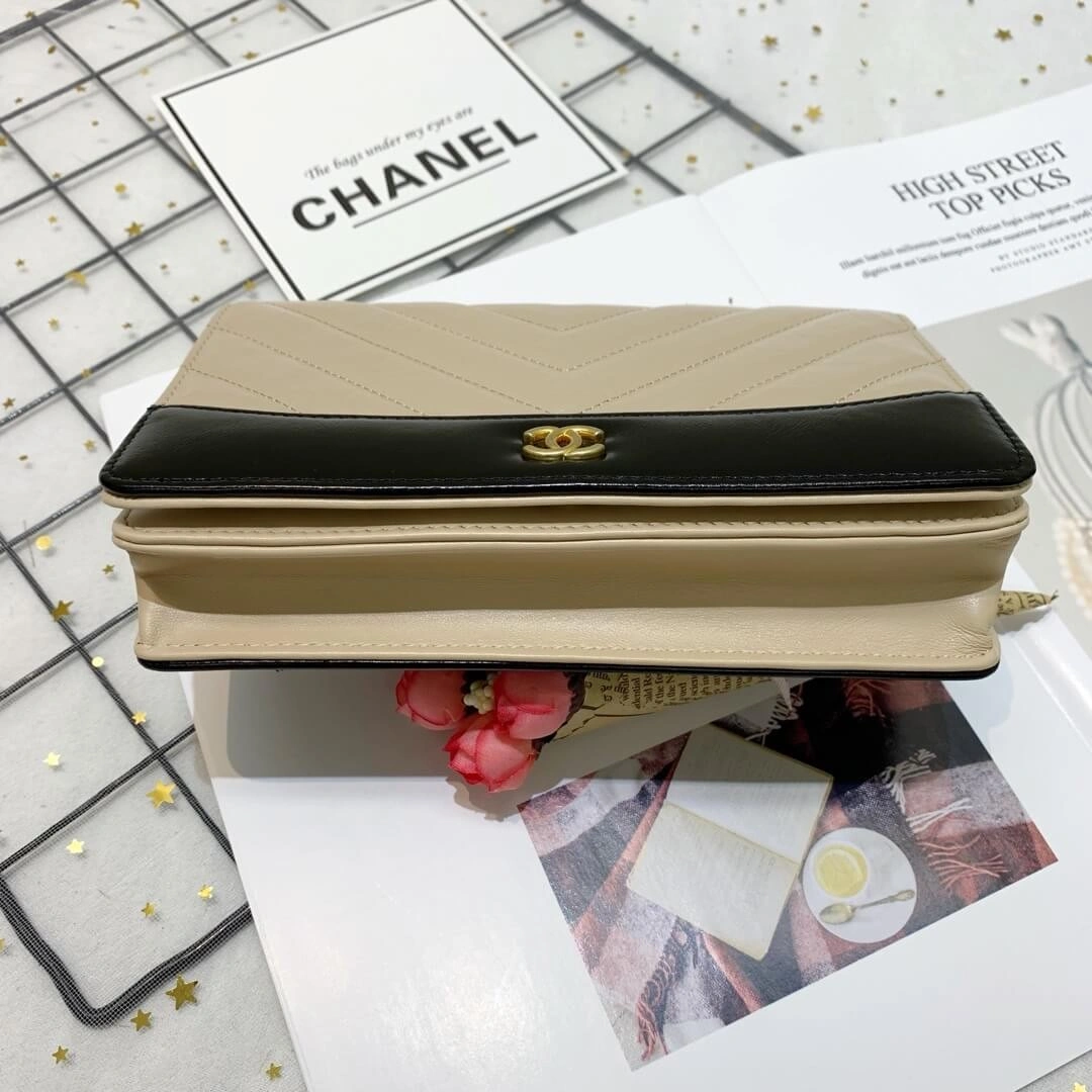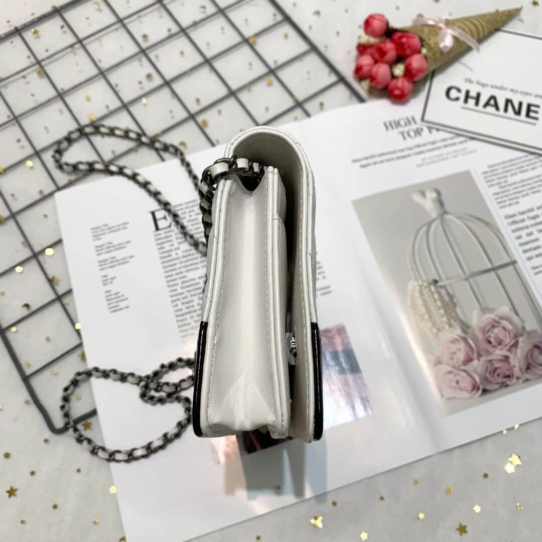 Discover the epitome of chic functionality with this beautifully structured wallet on a chain. Crafted from luxurious crinkled calfskin, this bag showcases a sophisticated chevron quilted pattern that adds a touch of timeless elegance to any ensemble. The bag’s textured finish is perfectly complemented by gleaming, polished gold-tone metal hardware, creating a look of refined glamour.