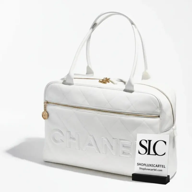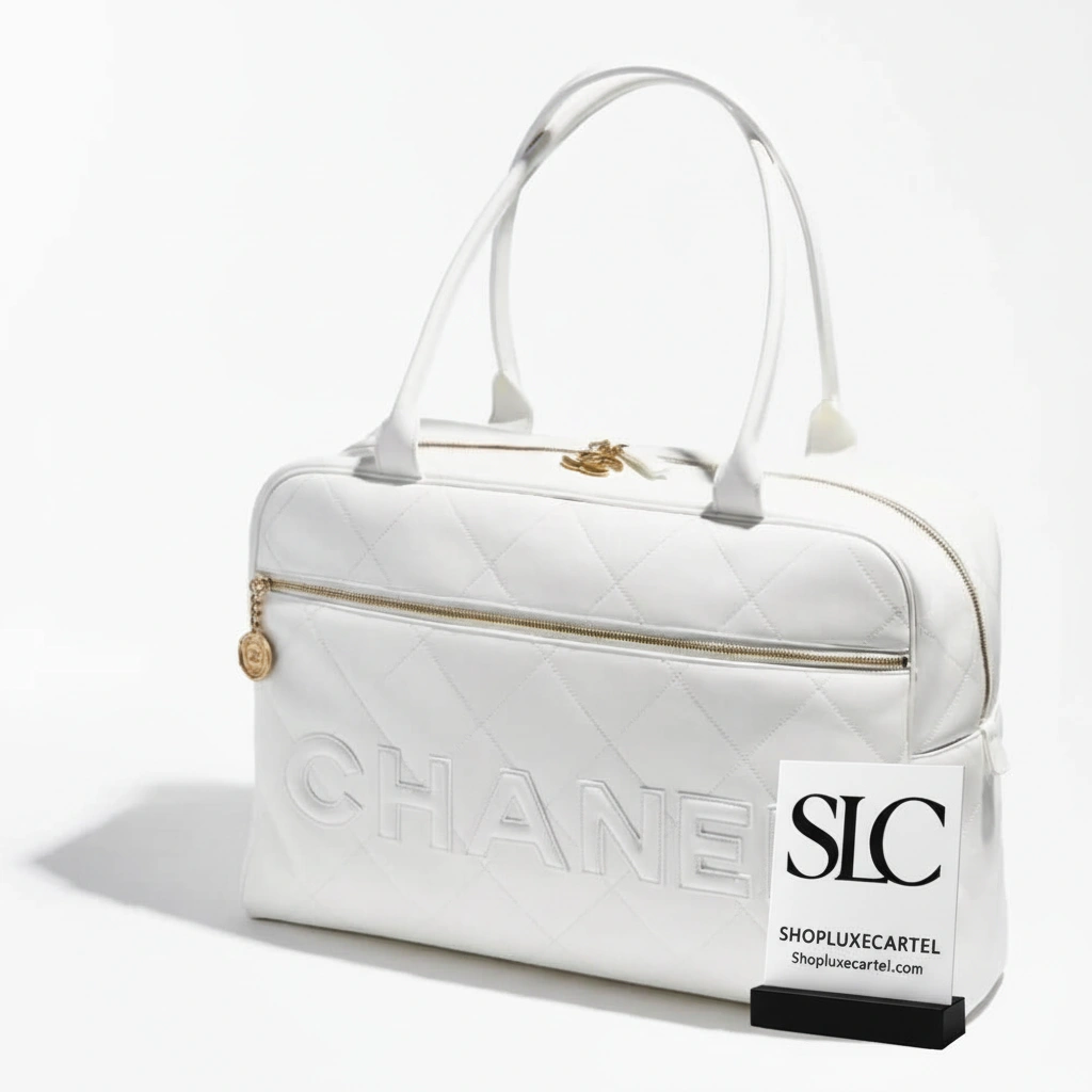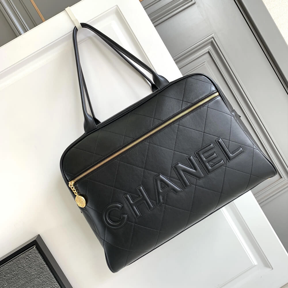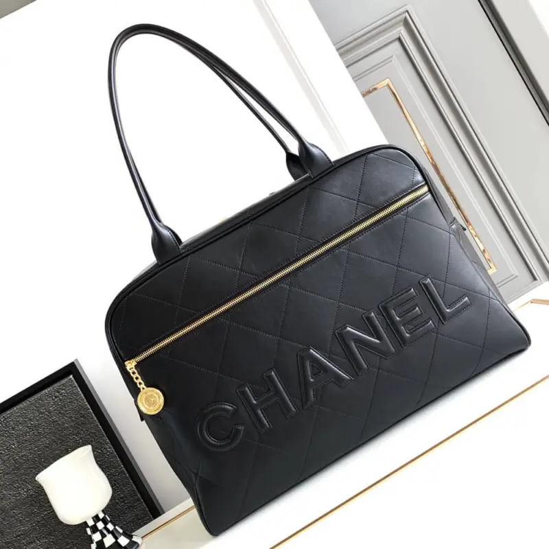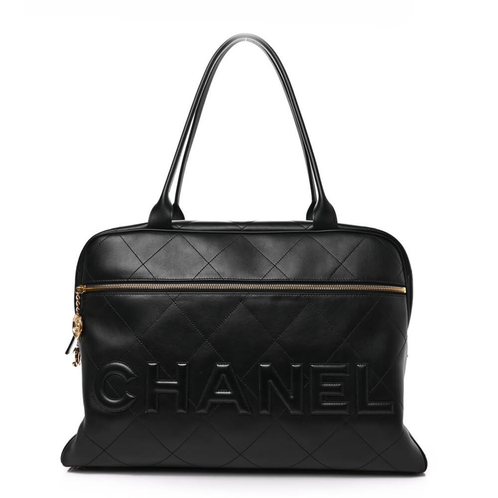 Crafted from luxurious quilted black calfskin leather, this spacious travel bag combines timeless style with practical design. Its generous silhouette makes it an ideal companion for weekend getaways or as a sophisticated daily carryall. The bag features comfortable rolled leather handles, a convenient front pocket, and elegant aged gold-tone hardware for a touch of classic refinement.