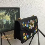 This elegant piece is distinguished by a sparkling, crystal-embellished metallic emblem on the front flap. A whimsical embroidered feline design on the back adds a unique and surprising touch of character, making this bag a true statement accessory. A polished chain strap completes the sophisticated design.