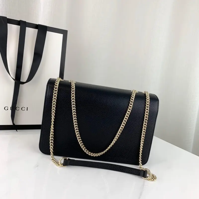 - Strap: Gold-tone chain and leather strap with a 21.5″ drop