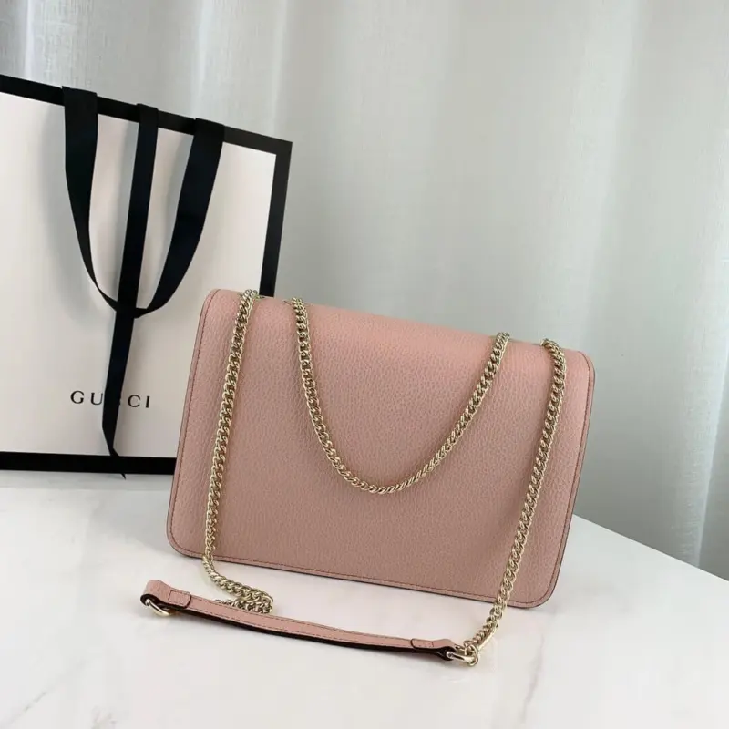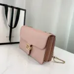 This chic shoulder bag offers a timeless design crafted from beautifully grained calfskin leather in a soft pink hue. The bag features a versatile waist-length shoulder strap combining polished gold-tone chain and leather for a sophisticated look. Its front-facing flap is adorned with a polished gold interlocking emblem, adding a touch of classic elegance.