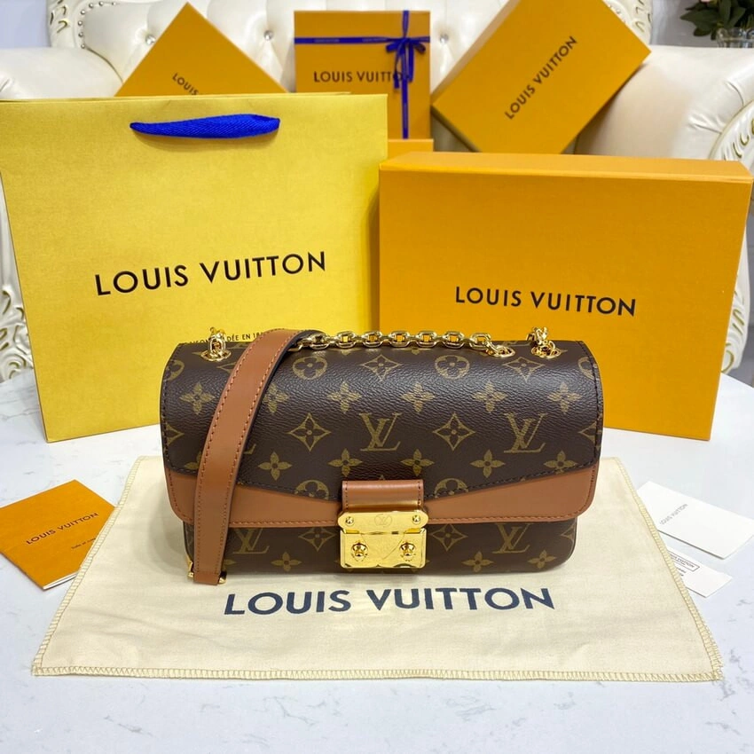 Designed for modern versatility, this piece features multiple compartments to keep your essentials organized and secure. A distinctive S-shaped clasp provides a secure closure, reminiscent of historic luggage locks. The elegant, gold-tone sliding chain strap includes a comfortable leather shoulder pad and can be adjusted for shoulder or crossbody wear.