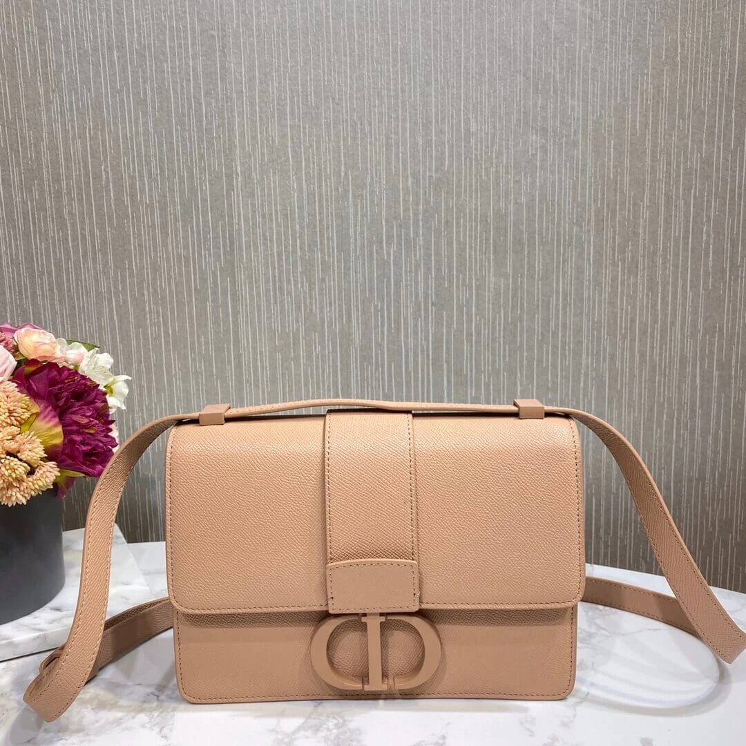 Inspired by a historically emblematic address, this handbag offers an elegant and timeless style crafted from luxurious stamped grained calfskin. The streamlined design is both sophisticated and functional, making it a versatile accessory for any occasion. It features a classic flap closure that is secured with a unique, shiny antique gold-finish two-initial clasp, adding a touch of refined detail.