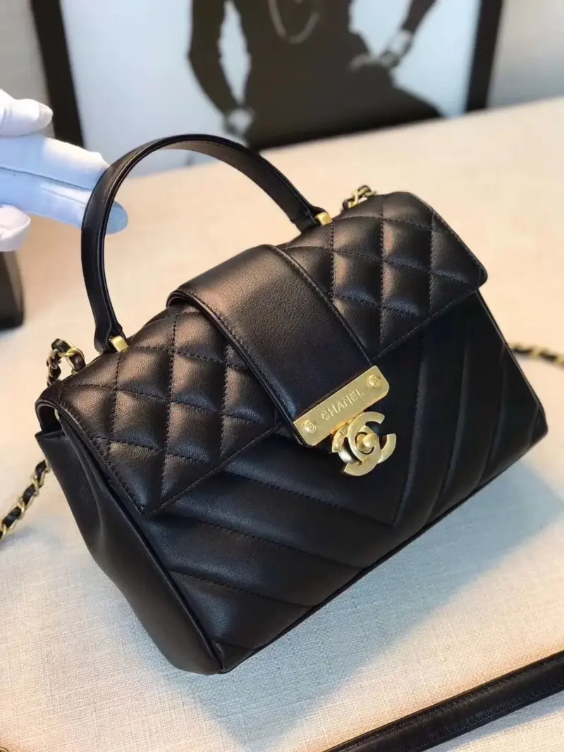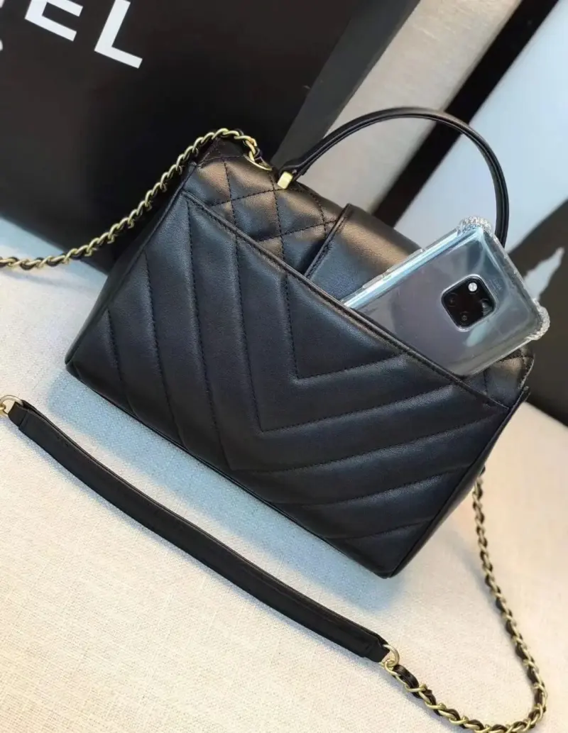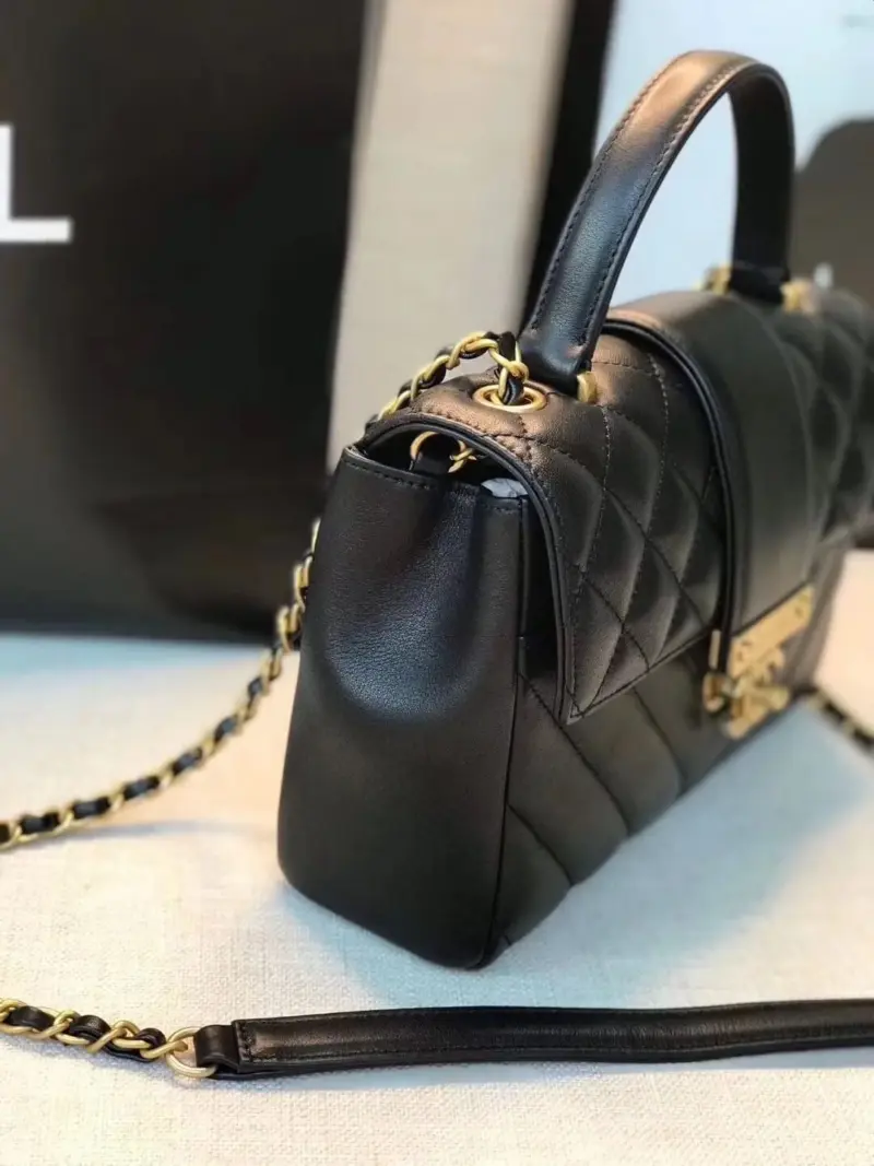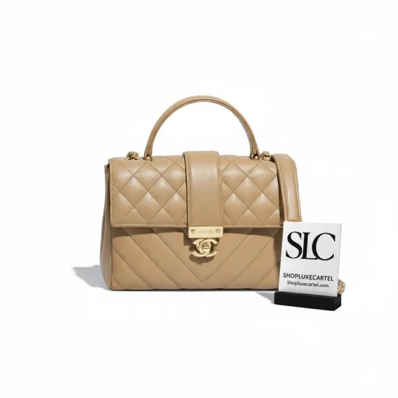 Discover a truly timeless accessory with this exquisitely crafted top-handle flap bag. Made from high-quality calfskin leather, this piece showcases a classic quilted finish that adds a touch of texture and sophistication. The structured design is complemented by a sturdy top handle and polished, gold-tone hardware, creating a look of effortless elegance.