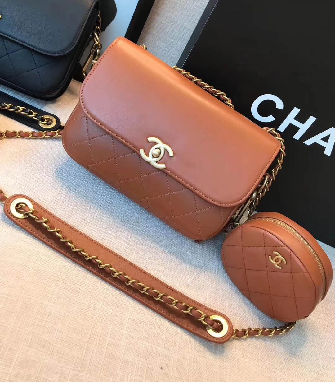 Made from supple calfskin leather and accented with polished gold-tone metal hardware, this piece exudes understated luxury. The elegant woven chain strap adds a touch of refinement and ensures comfortable wear. For added convenience, this shoulder bag comes complete with a matching coin purse, perfect for organizing your smaller essentials.