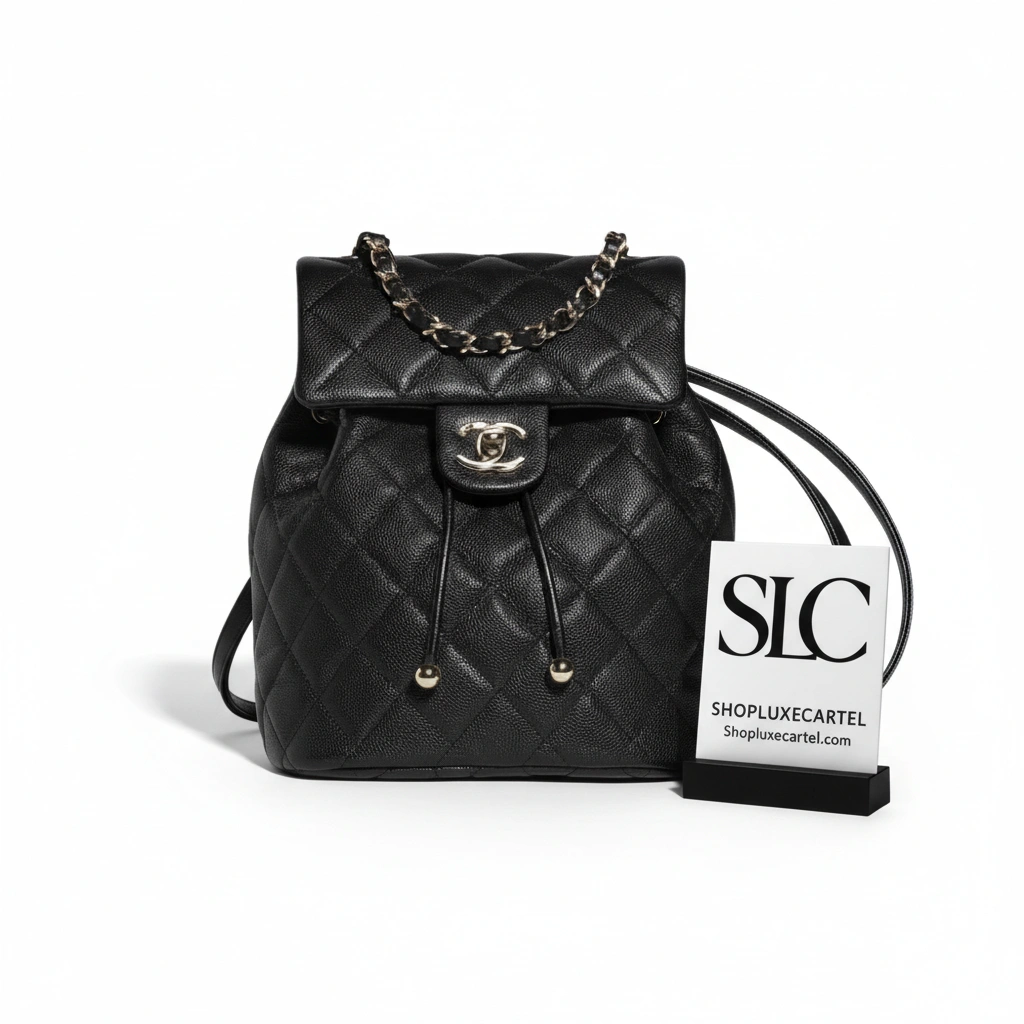 Discover a timeless accessory with this exquisitely designed small backpack. Crafted from luxurious, shiny grained calfskin, this piece showcases a sophisticated diamond-quilted stitching that lends it an air of classic elegance. Its structured yet supple silhouette makes it a versatile companion for any occasion, blending practicality with high-end style.