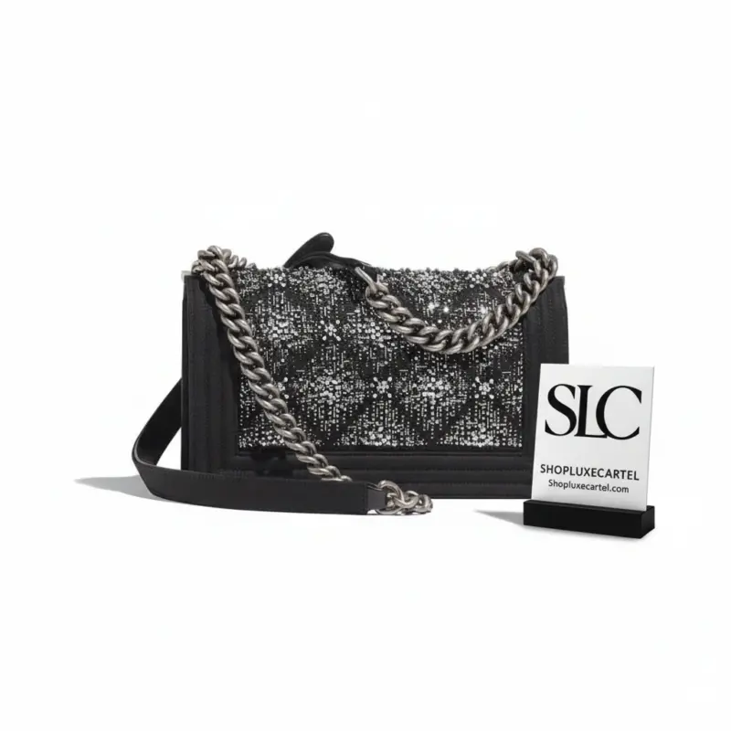 This handbag is designed for both style and practicality, transitioning seamlessly from a day accessory to an evening statement piece. The dark, polished metal hardware provides a chic contrast to the textured fabric, creating a versatile and eye-catching addition to any wardrobe.