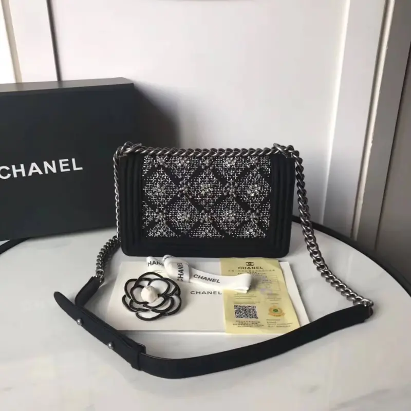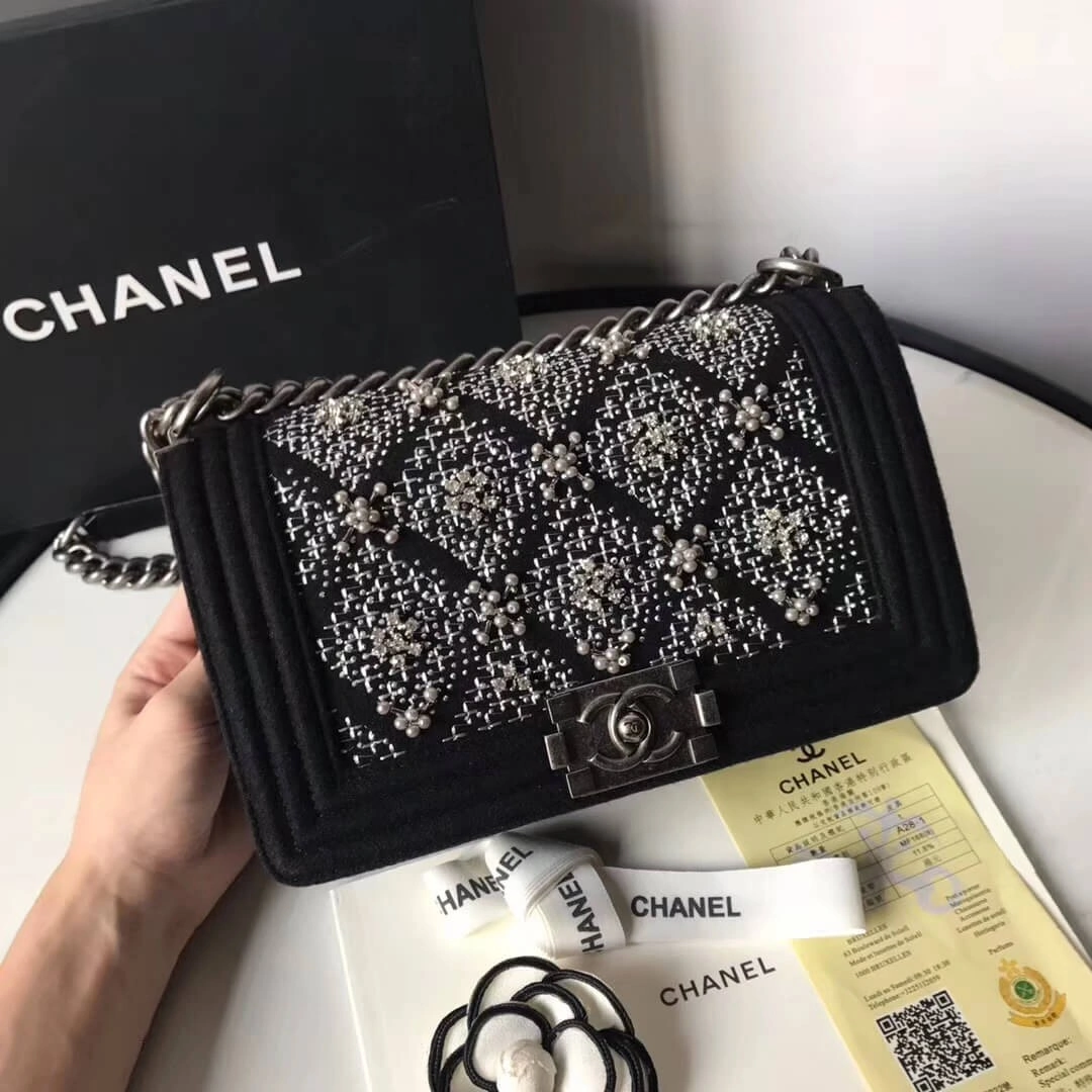 Discover a timeless accessory with this beautifully structured, flap-style shoulder bag. Featuring a classic quilted design, this piece offers a sophisticated and elegant look perfect for any occasion. The soft, durable wool exterior is complemented by striking decorative crystal elements and a bold, chunky chain strap, adding a touch of modern edge to its refined silhouette.