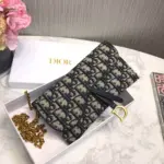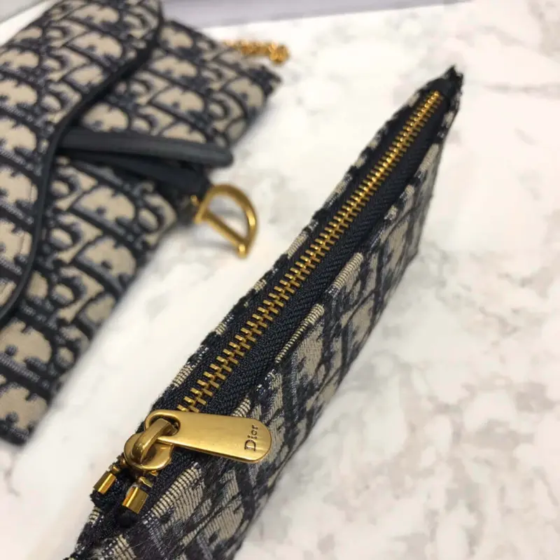 This accessory is meticulously crafted from a durable blue jacquard canvas, featuring a sophisticated allover pattern for a touch of distinction. Complemented by smooth blue calfskin leather details and aged gold-tone metal hardware, it exudes an air of understated luxury. The well-organized interior ensures your valuables are kept secure and within easy reach.