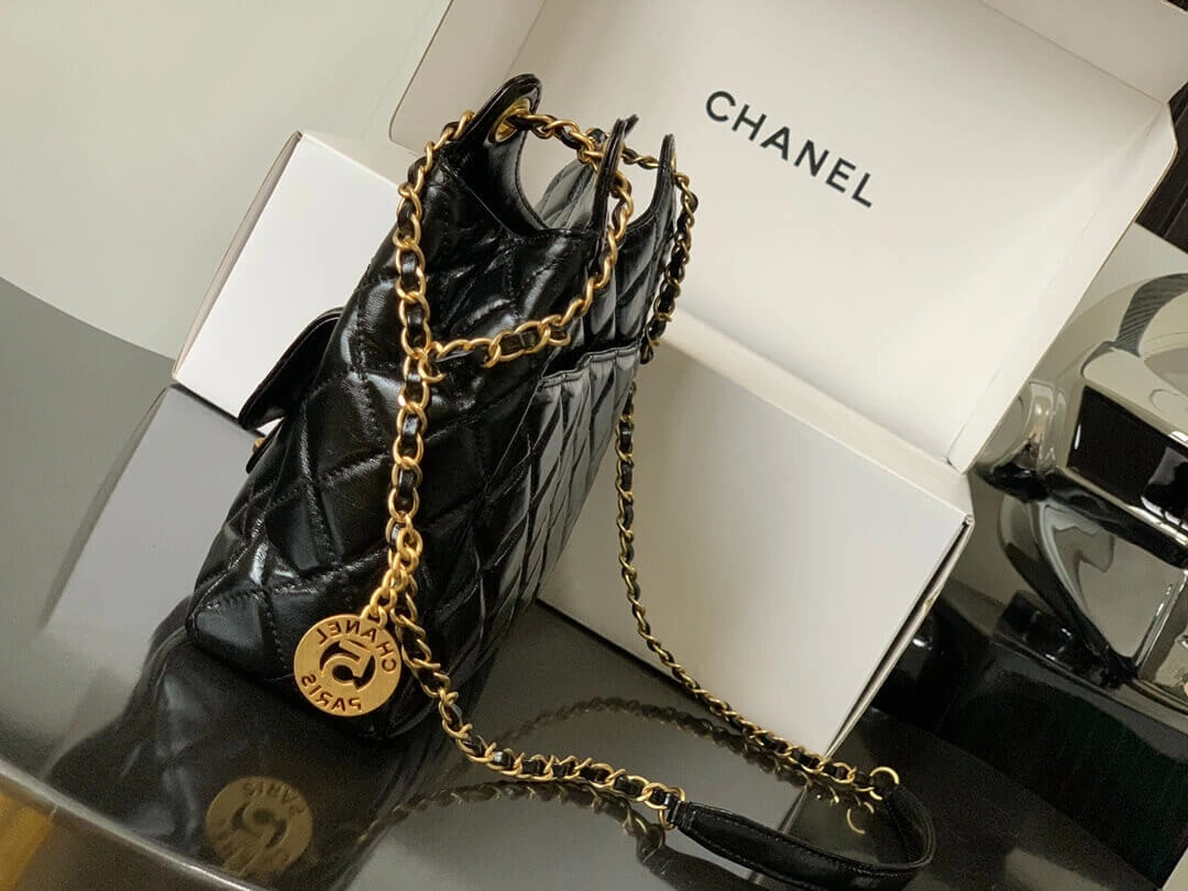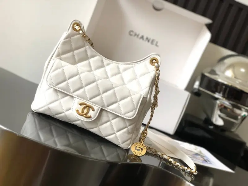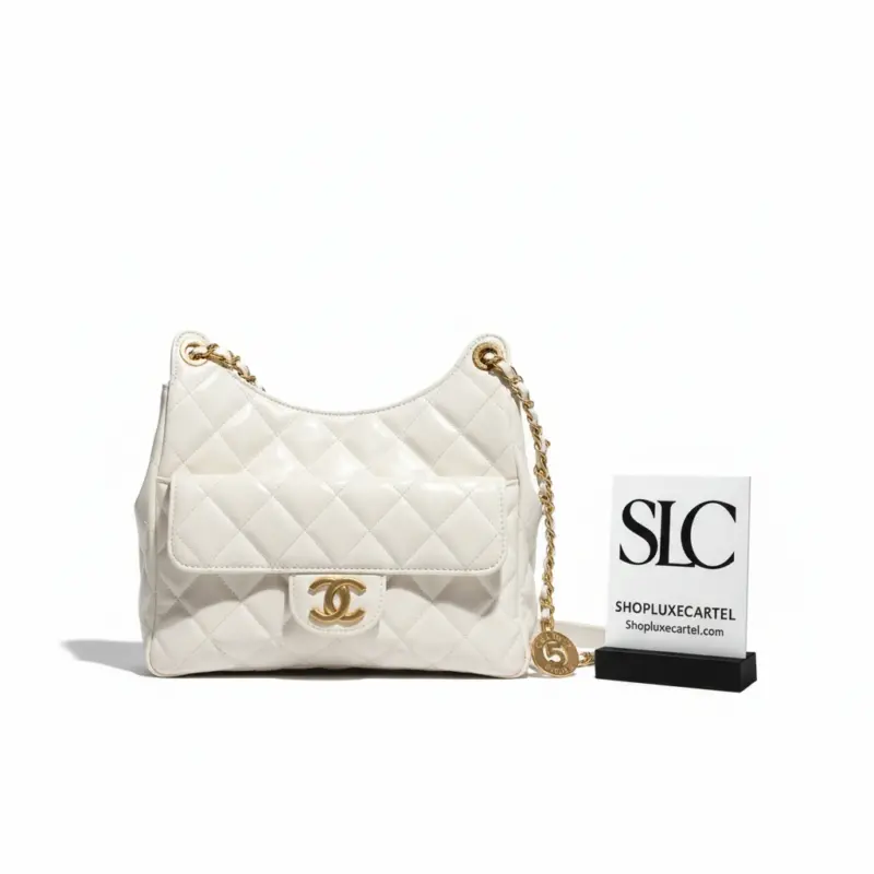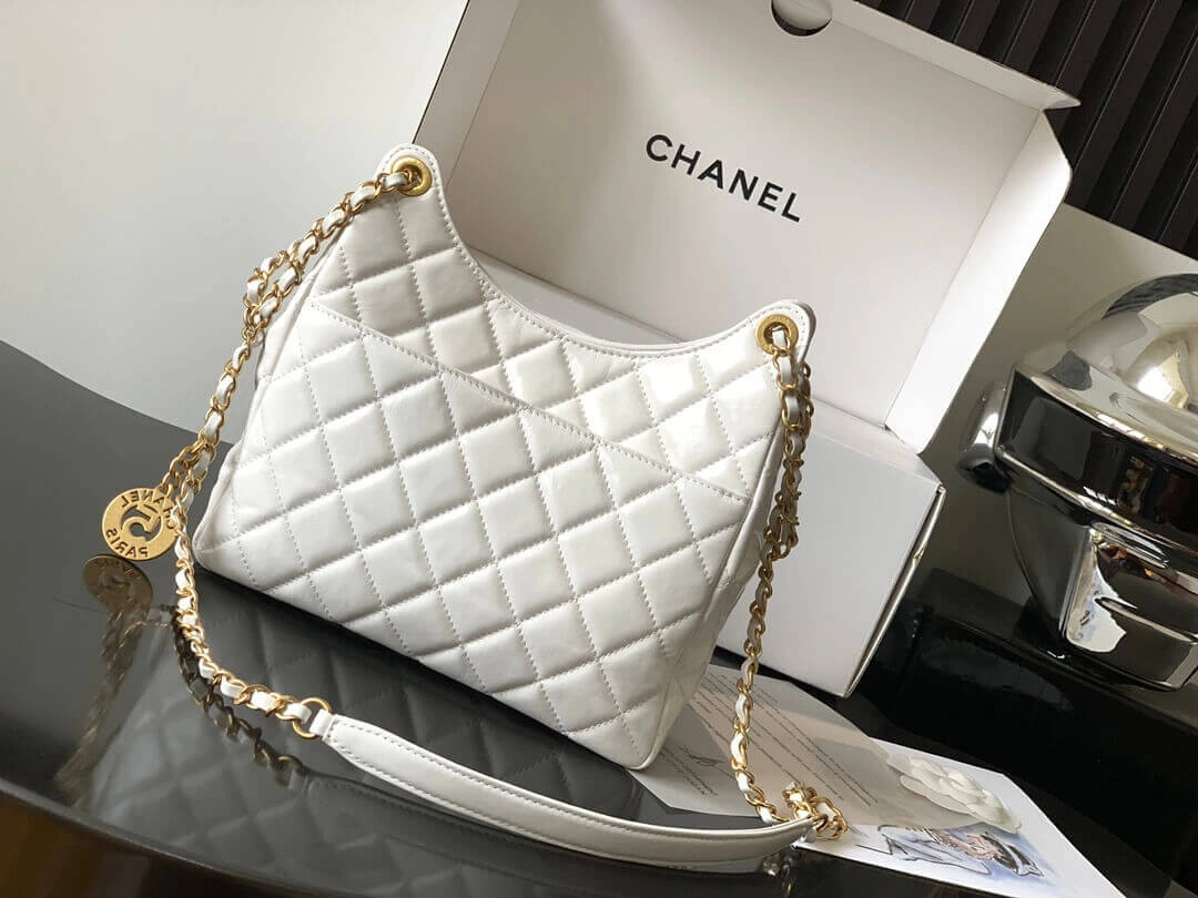 Designed for both style and practicality, this hobo bag features a spacious and well-organized interior. The soft lambskin lining houses multiple pockets, including a central zipped compartment, ensuring your essentials are kept secure and easy to find. An elegant woven chain-and-leather strap provides a comfortable carry, while a classic exterior back pocket offers convenient access to your most-used items.