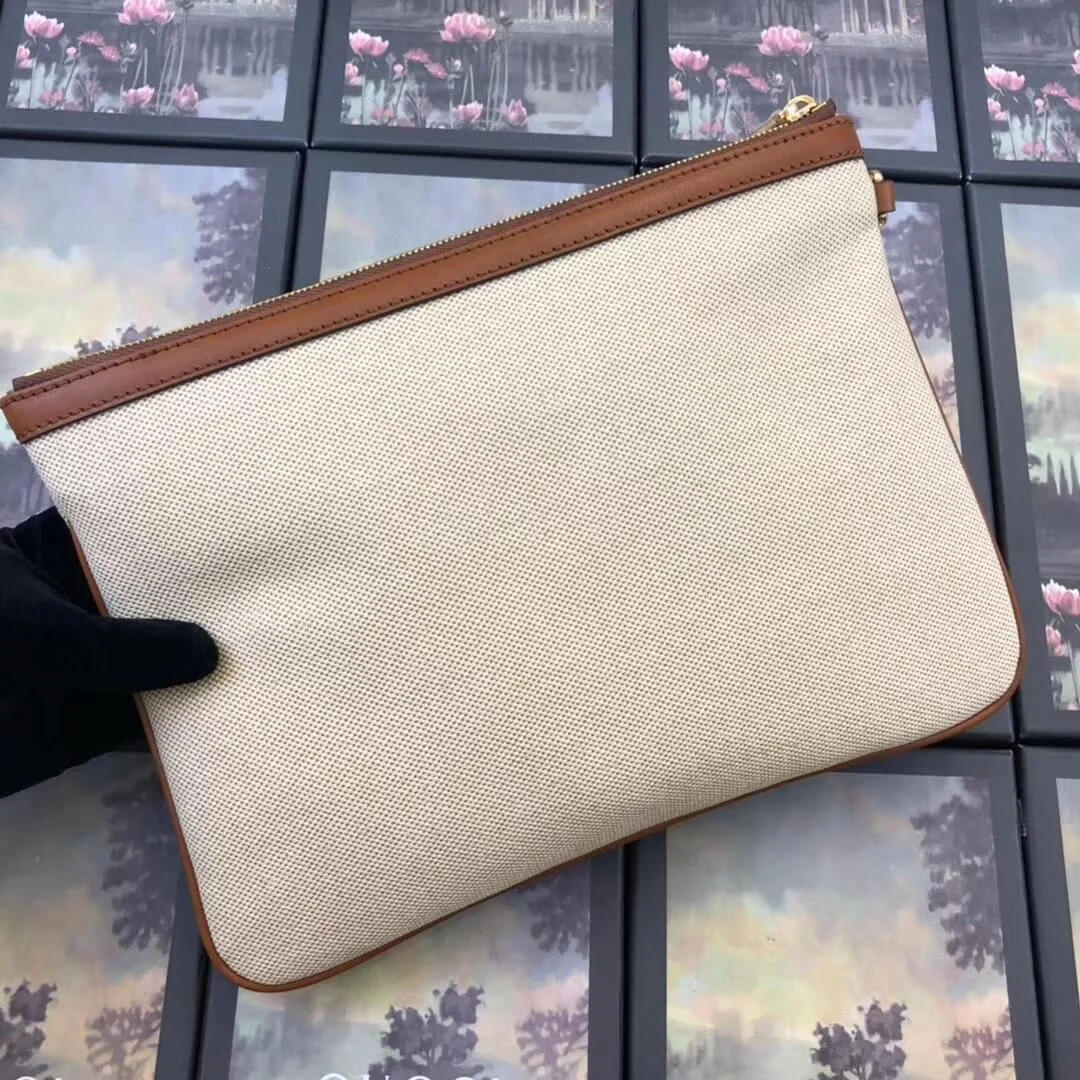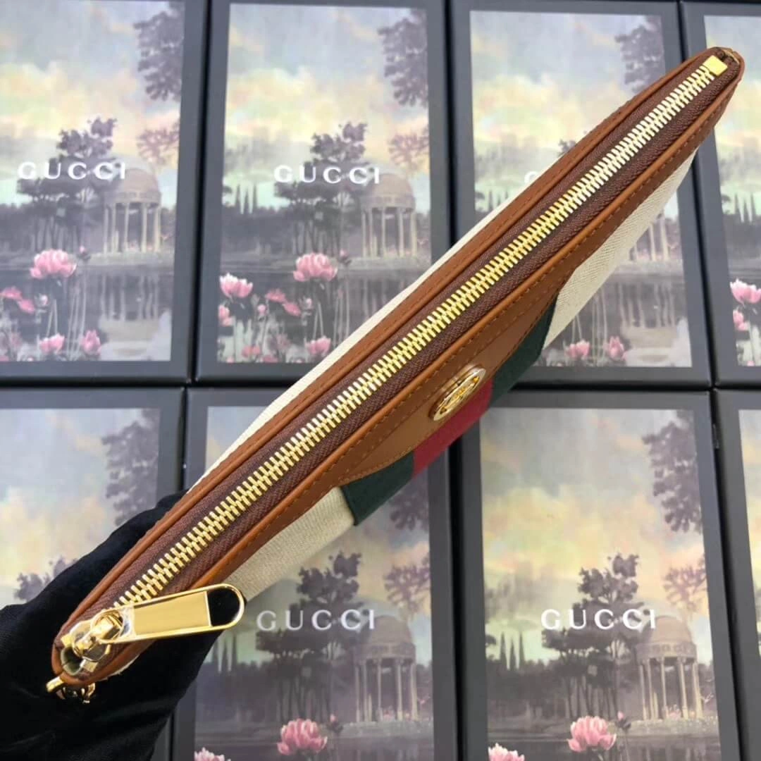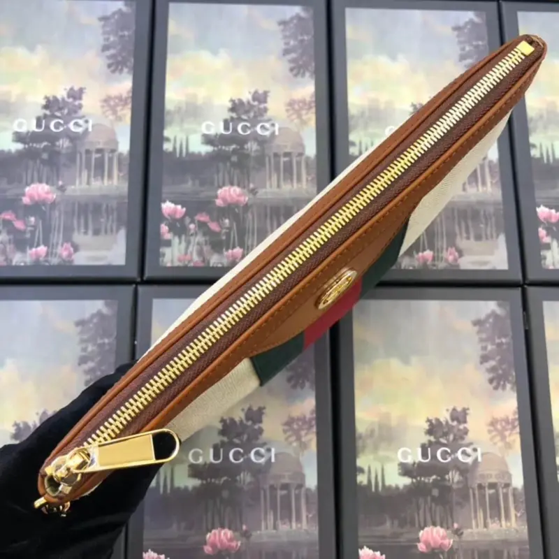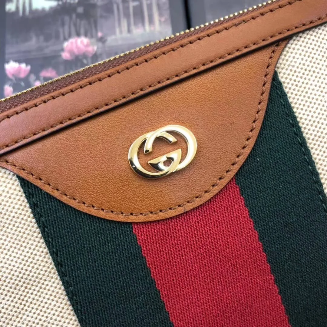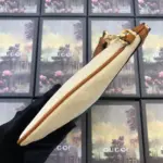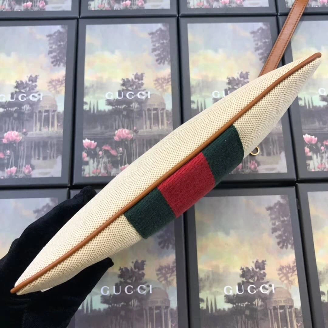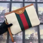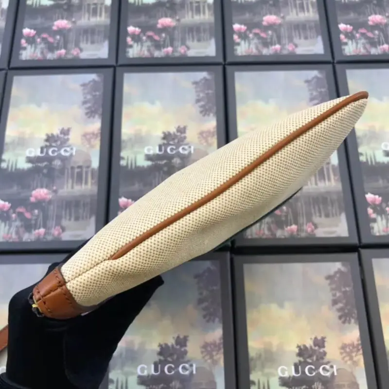Experience timeless style and exceptional versatility with this beautifully crafted travel pouch. The design is centered around a durable beige canvas, elegantly accented with a classic green and red striped webbing detail and rich golden brown leather trim. Polished gold-tone hardware adds a refined touch to this essential accessory, making it a sophisticated choice for organizing your necessities.