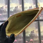 This pouch offers practical features for modern needs, including an optional, matching wristlet strap for secure and convenient carrying. A smooth top zipper closure opens to a soft, pale green fabric interior, providing ample space for cosmetics, tech accessories, or other daily essentials. Its compact and functional design makes it perfect for use on its own or as an organizer inside a larger handbag.
