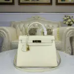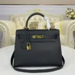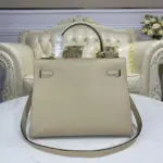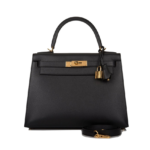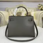 The bag’s interior is just as thoughtfully designed, lined in soft and luxurious chèvre leather. A polished front toggle closure keeps your belongings secure, while a full set of accessories, including a matching leather key holder with a lock and two keys, adds a final touch of refined functionality.