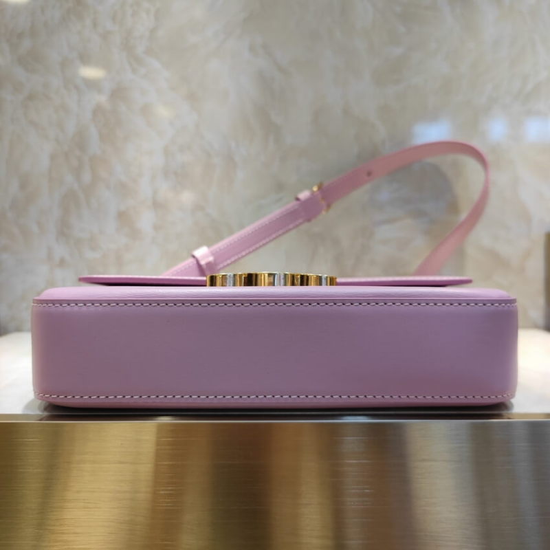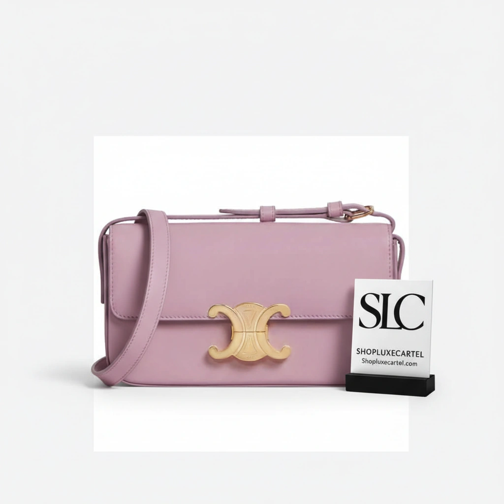 Experience timeless sophistication with this impeccably crafted shoulder bag, presented in a unique lavender grey hue. Constructed from high-quality shiny calfskin, this accessory features a sleek, structured silhouette that offers a modern yet classic appeal. The bag is elegantly appointed with polished gold-finish hardware, including a distinctive metallic clasp that serves as a stunning centerpiece.