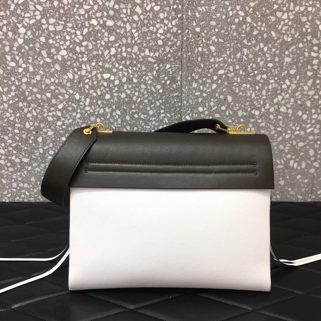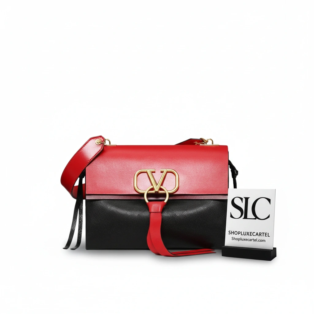 Expertly constructed from a sophisticated blend of smooth calfskin and colored buffalo leather, this shoulder bag offers both timeless style and everyday durability. The design is distinguished by a prominent V-shaped metal logo on the front flap, which is elegantly accented with a matching ring and a decorative leather tie. This signature hardware provides a refined and recognizable finish.