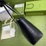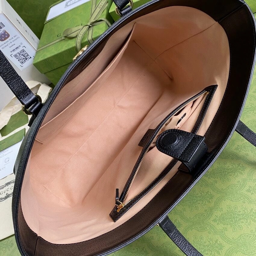 Showcasing a timeless aesthetic with vintage-inspired details, this tote is crafted for the modern wardrobe. Its softly structured silhouette, presented in elegant black leather, offers a sophisticated and versatile accessory for any occasion. The design pays homage to classic equestrian style with its iconic striped webbing and gleaming gold-toned hardware.