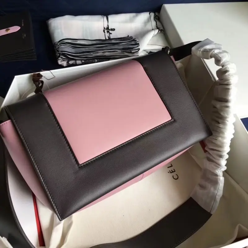 Experience sophisticated style with this beautifully structured shoulder bag, defined by its bold color-block design. Crafted from exceptionally soft lambskin leather, this piece showcases a clean, minimalist aesthetic that is both modern and timeless. The wide, comfortable leather strap allows for an easy shoulder carry, making it a versatile accessory for any occasion.