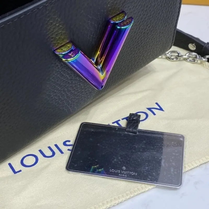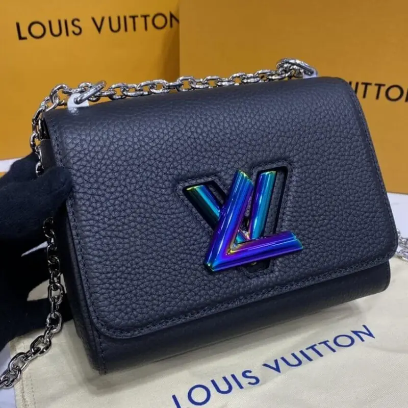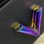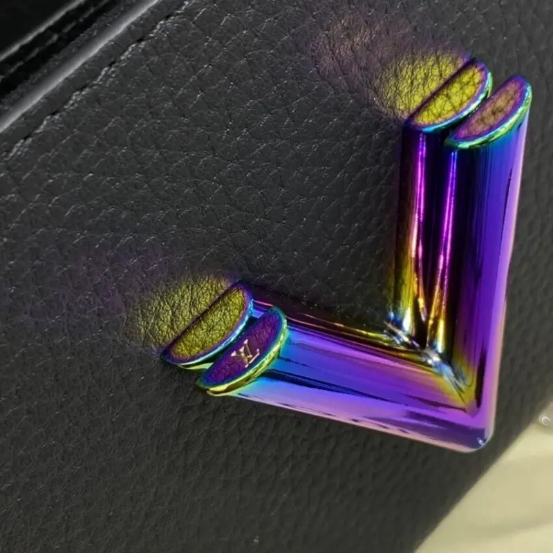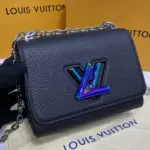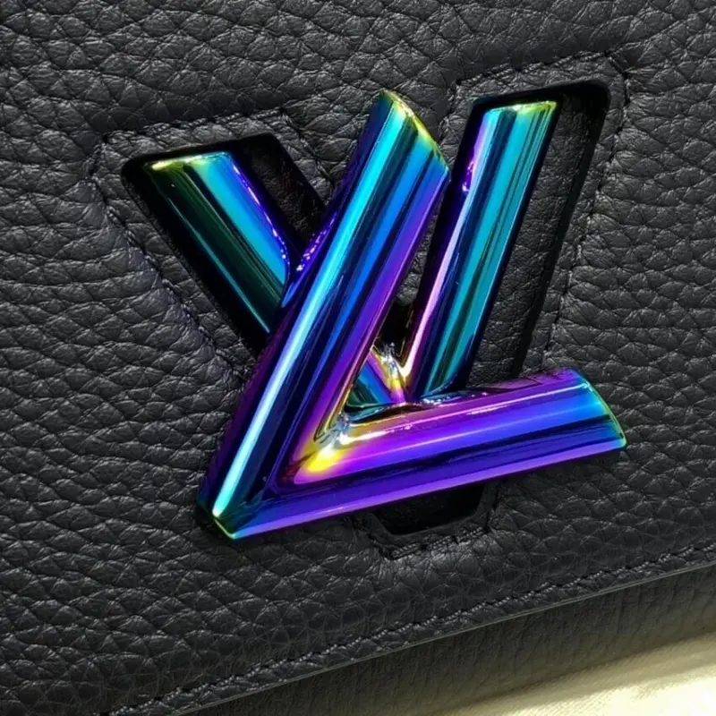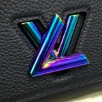 This beautifully structured crossbody bag exudes modern elegance. Crafted from supple grained leather, it showcases a captivating metallic finish that appears to shift in color depending on the light. A polished, jewel-like twist-lock closure and dark silver-tone hardware complete the sophisticated and contemporary design.