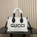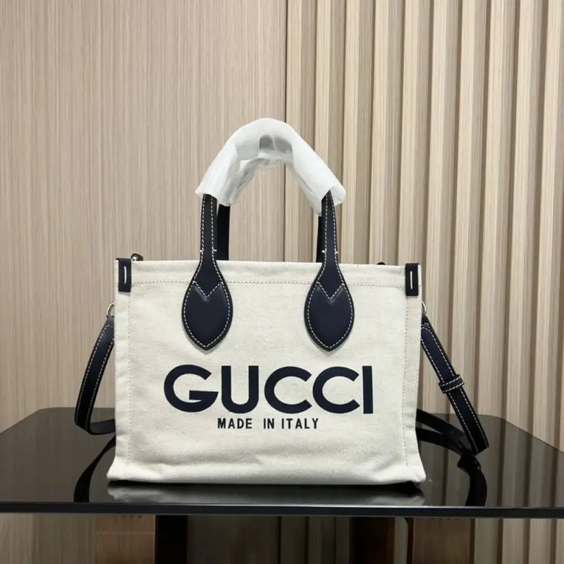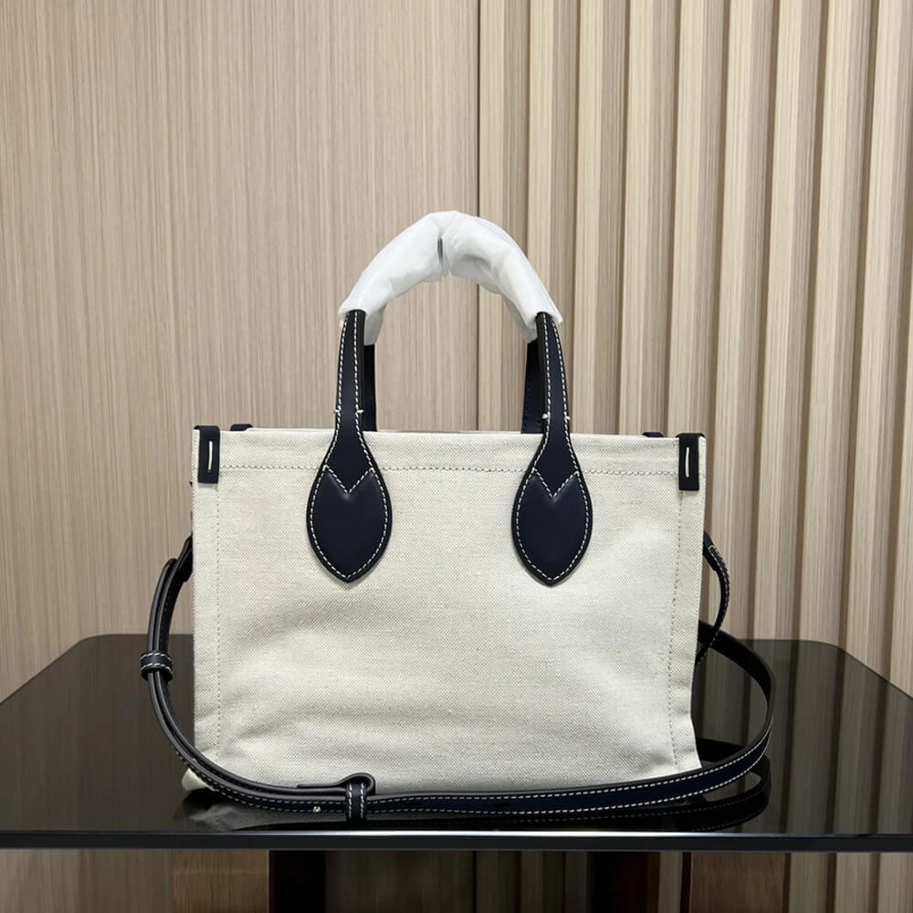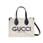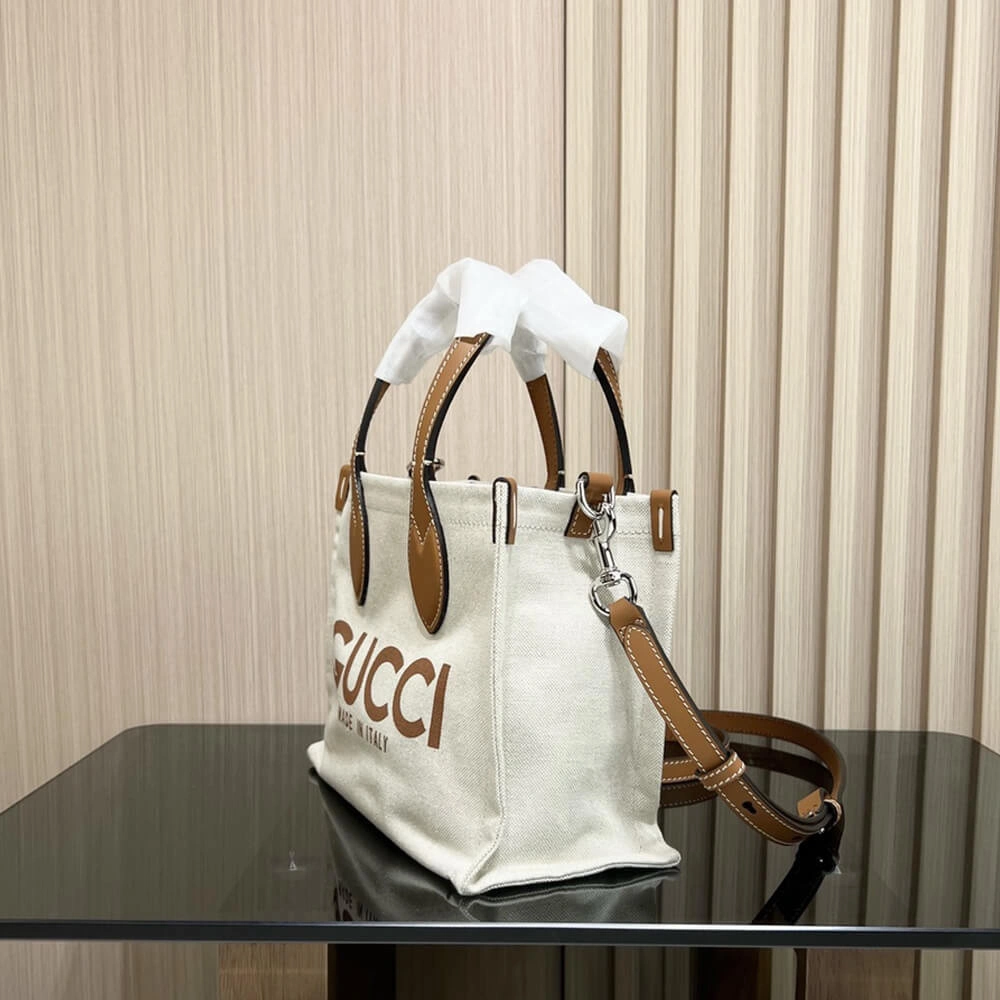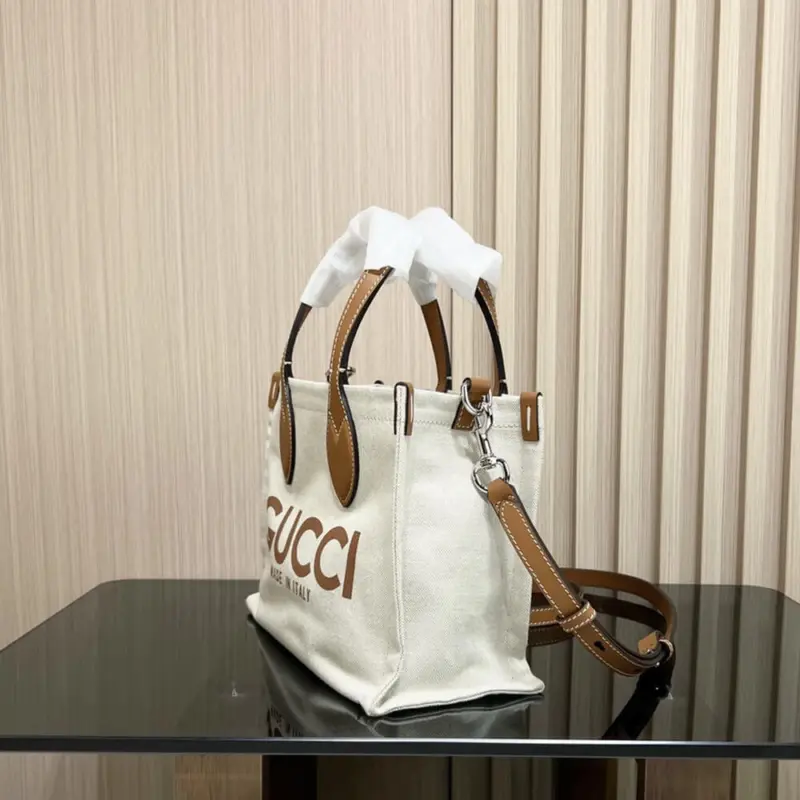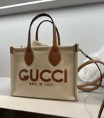 Discover timeless style with this versatile and compact tote bag, meticulously crafted from a durable beige cotton linen canvas. The bag is elegantly accented with a light brown leather trim and polished, silver-toned hardware, creating a sophisticated contrast. Its front is adorned with a distinctive ‘Made in Italy’ print, adding an element of classic European craftsmanship to the design.