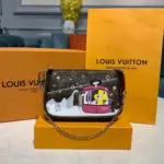 Celebrate a love for travel with this special holiday edition mini pochette. It features a durable coated canvas brought to life by a playful, brightly colored illustration of a whimsical character enjoying a cable-car ride in a chic mountain resort. This pouch is a delightful and practical accessory, perfect for organizing essentials within a larger bag or carrying on its own for a minimalist look.