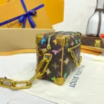 This compact crossbody is thoughtfully designed with reinforced corners reminiscent of classic travel trunks. Polished gold-tone hardware, including a decorative chain on the front zipper and a matching accent on the adjustable strap, adds a refined finish. Its structured silhouette offers both style and practicality, making it a versatile choice for everyday use.