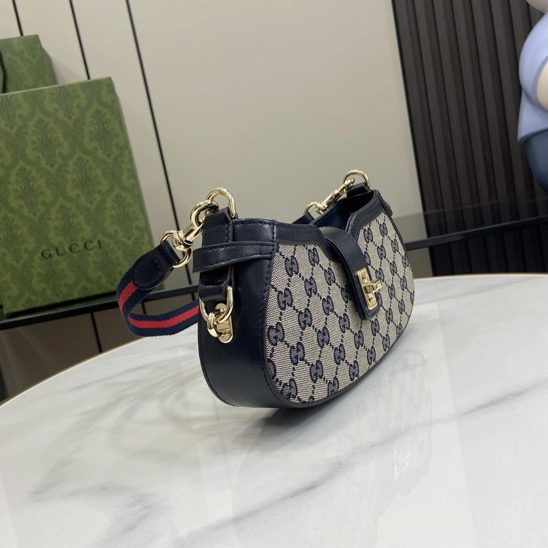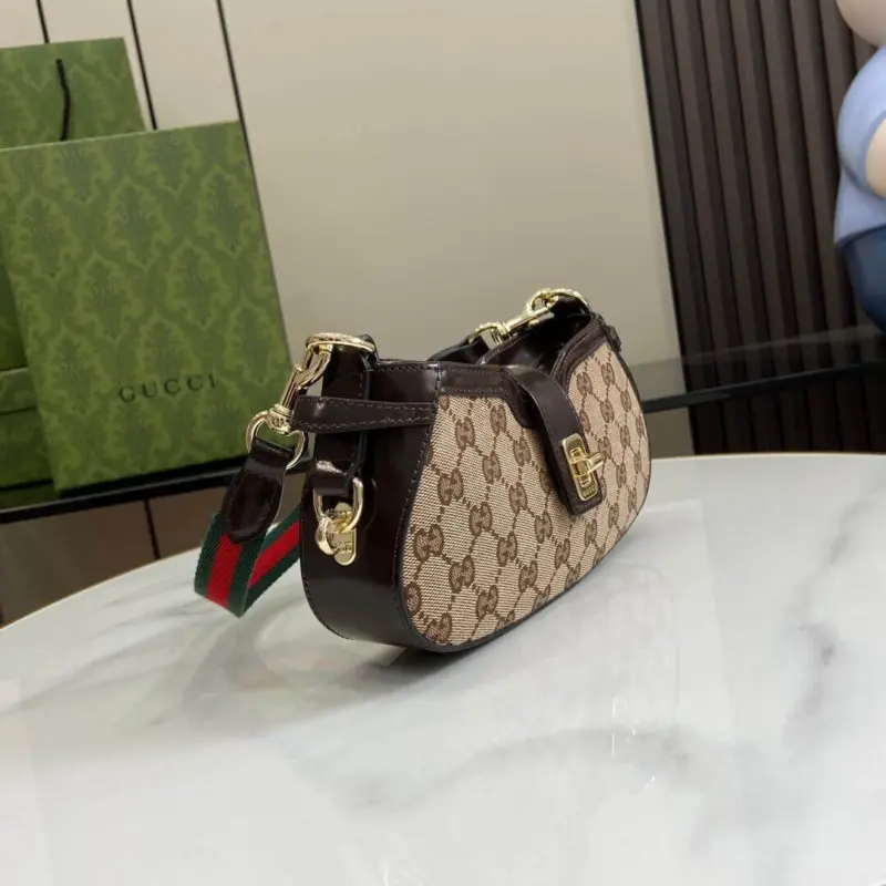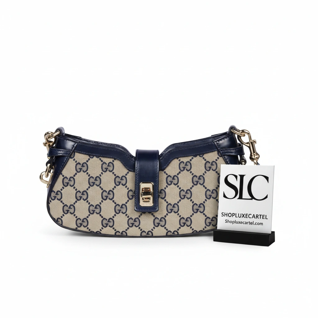 A detachable strap, distinguished by a green and red stripe detail, provides a signature accent and versatile carrying option. The secure turn-lock and zip closure ensure belongings are safely stored, while the thoughtfully designed interior is spacious enough for all your evening essentials.