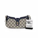 Inspired by the elegant beauty of a crescent moon, this mini shoulder bag features a distinctive, curved silhouette. The compact design is crafted from a durable coated canvas with a classic geometric print in beige and ebony, complemented by rich brown leather trim. Polished light gold-toned hardware adds a touch of sophisticated shine to the overall design.