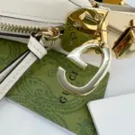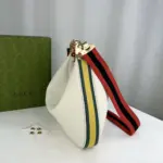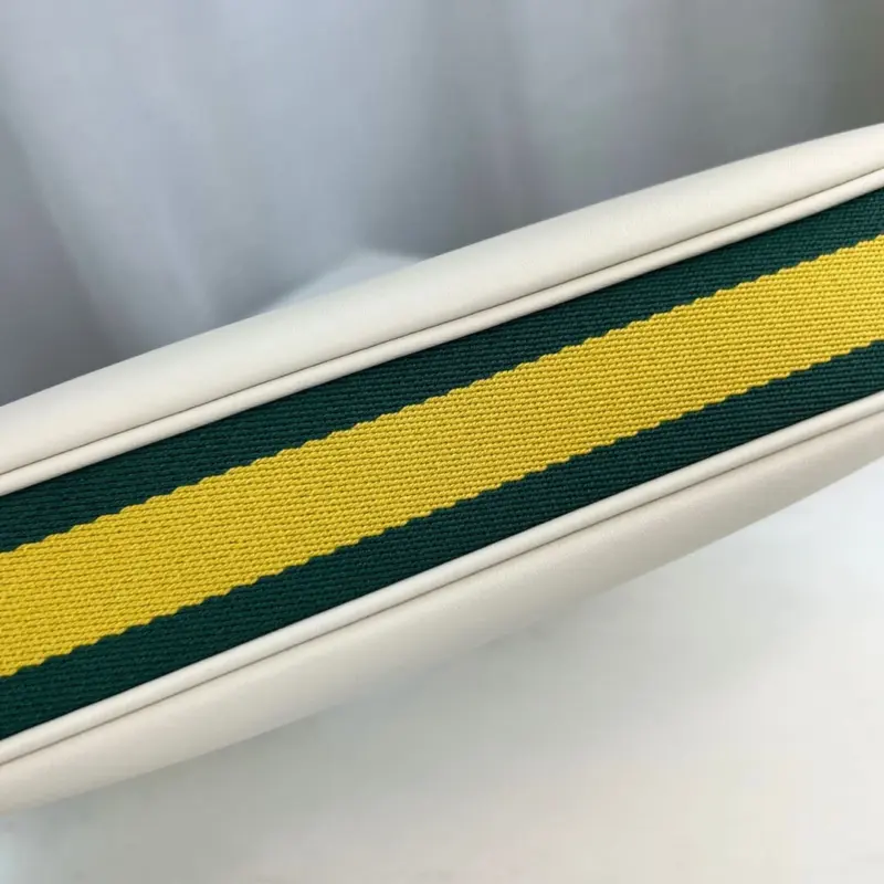 This versatile accessory is further defined by a bold orange and black striped trim and a unique G-shaped hook closure. It includes two detachable shoulder straps—one in coordinating leather and another in a contrasting striped fabric—allowing you to customize your carry style. The well-appointed interior ensures your essentials are organized and secure.