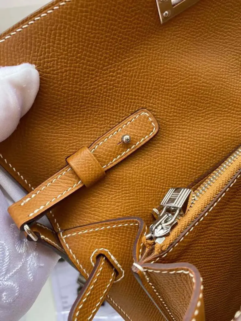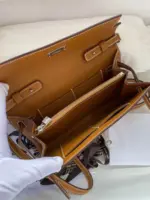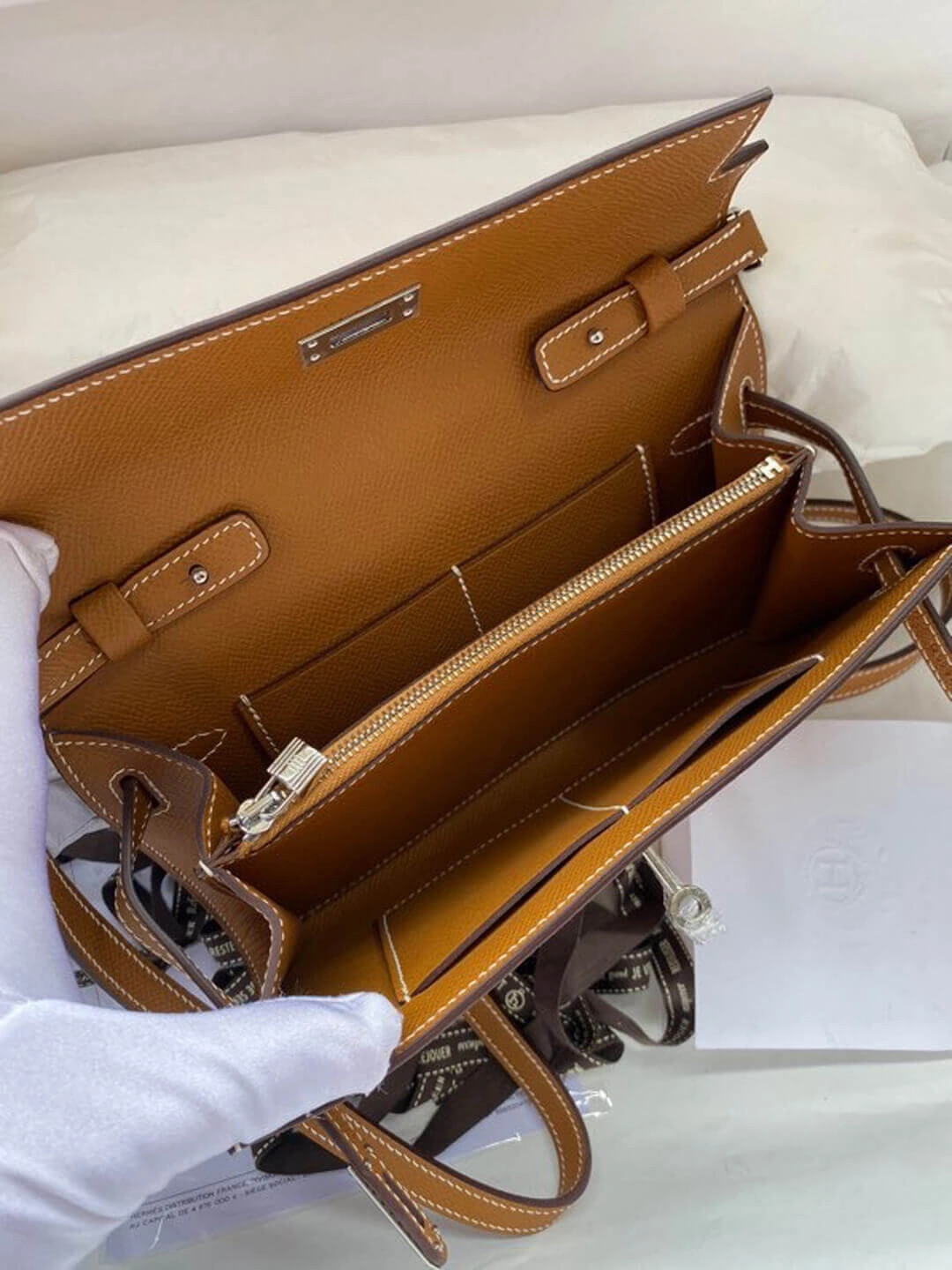 • Interior: Leather-lined with a partitioned main compartment, a zipper pocket, card slots, and patch pockets