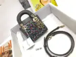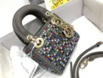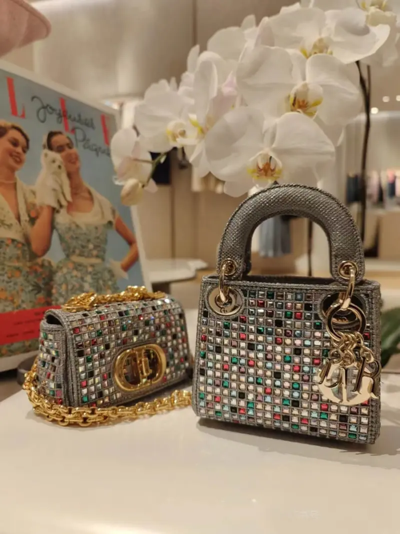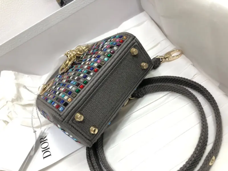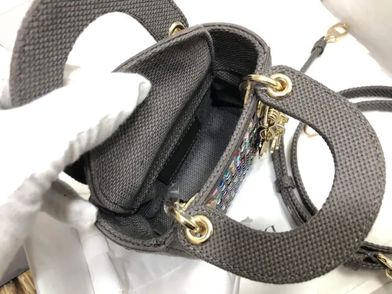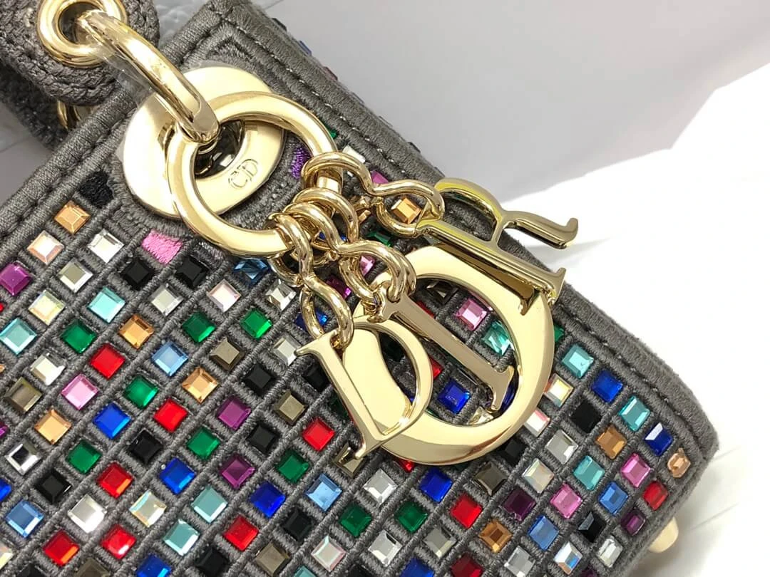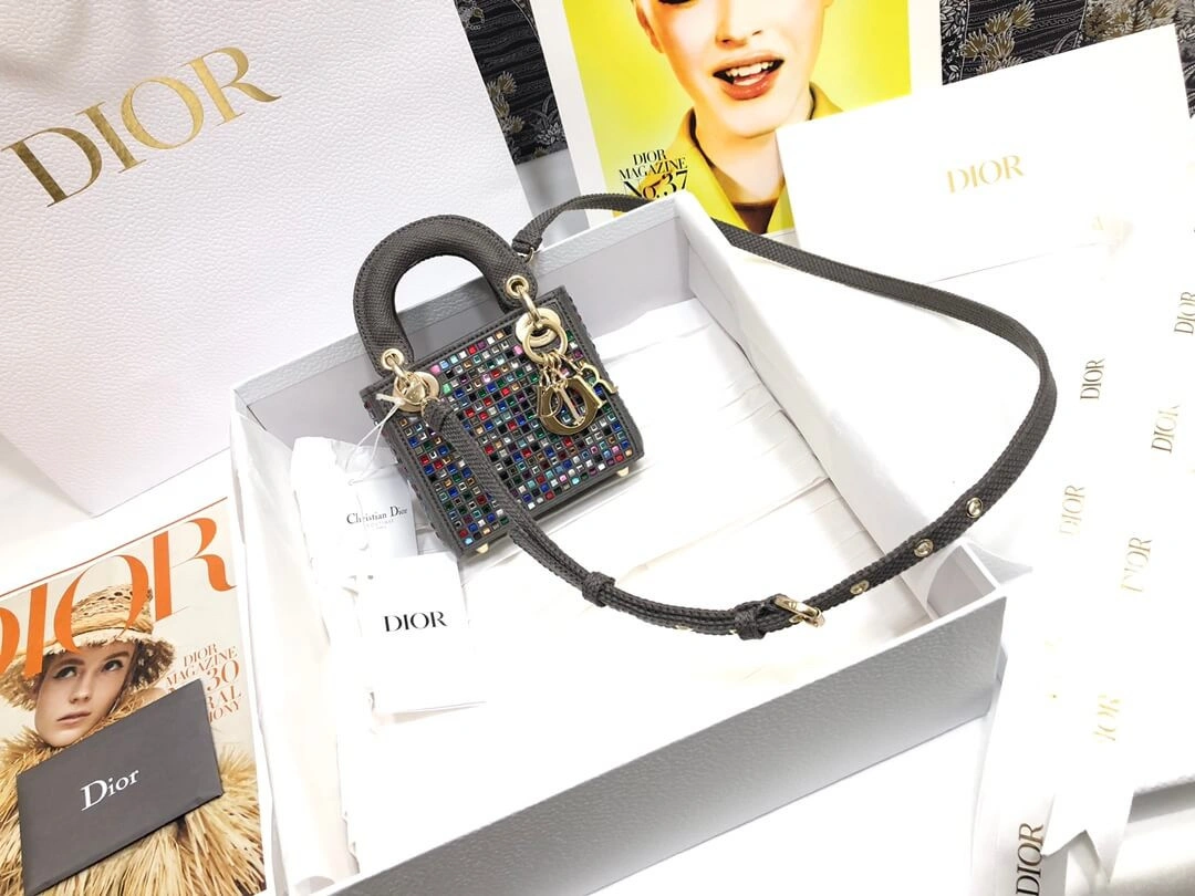 This exquisite micro bag showcases a vision of elegance and refined beauty. Expertly crafted from a dark grey metallic canvas, its classic silhouette is brought to life with an intricate embroidery of multicolor crystals that shimmer with every movement. This compact style is perfectly proportioned to hold all your small essentials for any occasion.