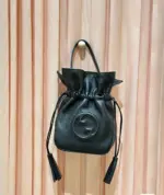 Discover a piece that exudes subtle style and contemporary design, perfect for any evening affair. This mini bucket bag, crafted from fine, tonal leather, showcases a sophisticated and modern aesthetic. Its unique cylinder shape is accentuated by a distinctive rounded geometric emblem, creating a look that is both elegant and understated. Finished with playful leather tassels, this bag offers a touch of refined charm.