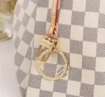 This beautifully structured hobo bag exudes a fresh and feminine aesthetic, crafted from a supple coated canvas featuring a timeless blue and white checkerboard pattern. The design is elegantly accented with gleaming golden-toned hardware and a sophisticated, handcrafted leather handle that provides a comfortable and stylish shoulder carry. A chic, detachable charm adds a touch of playful elegance and can be used as a key hanger inside the bag.