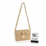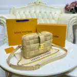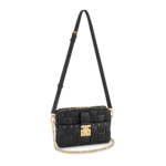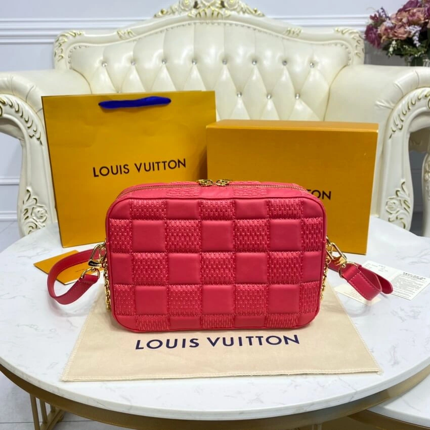 Inspired by the classic silhouette of vintage camera bags, this stunning handbag is meticulously crafted from padded lambskin, featuring an oversized checkerboard embroidery for a plush, textured finish. The bag’s structured square shape is elegantly detailed with polished gold-tone hardware, studded trim, and reinforced corners for added durability and style.