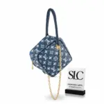 This square shoulder bag offers a contemporary silhouette crafted from a unique sand-washed denim. The fabric is intricately woven with a classic, repeating pattern, creating a sophisticated textured finish. Genuine cowhide leather trim and polished metal hardware provide a refined contrast, enhancing the bag’s structured design.