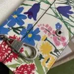 Celebrate timeless style with this beautifully crafted super mini bag, presented in elegant ivory leather. The exterior is adorned with a vibrant, all-over floral print, creating a fresh and eye-catching look. This compact accessory is perfectly sized for your essentials and is distinguished by an ornate, textured buckle with a unique design.