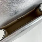 Illuminate your ensemble with this stunning shoulder bag, crafted from a shimmering silver lamé leather. The bag’s brilliant exterior is complemented by an ornate, crystal-embellished tiger head clasp that serves as a captivating focal point. This piece combines opulent detailing with a structured silhouette for a look that is both glamorous and sophisticated.