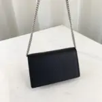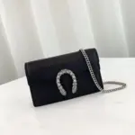 The bag’s defining feature is an ornate, crystal-embellished clasp that creates a striking focal point. This unique hardware adds a touch of opulence and secures your belongings with a pin closure that features a convenient side release. Meticulously designed, this piece is the epitome of functional luxury, seamlessly blending sophisticated design with practical features for the modern wardrobe.