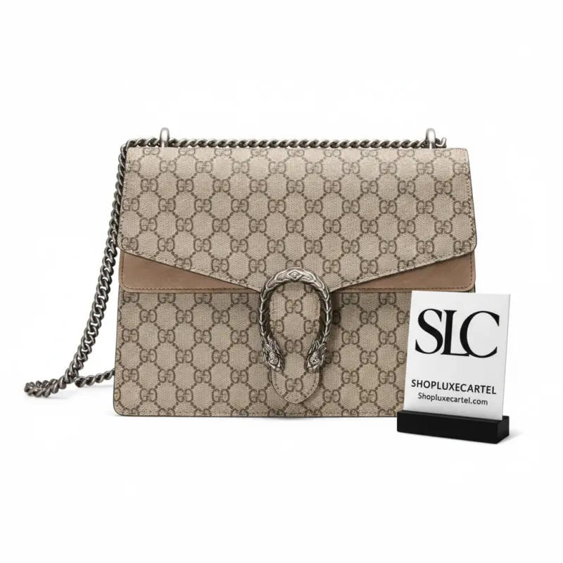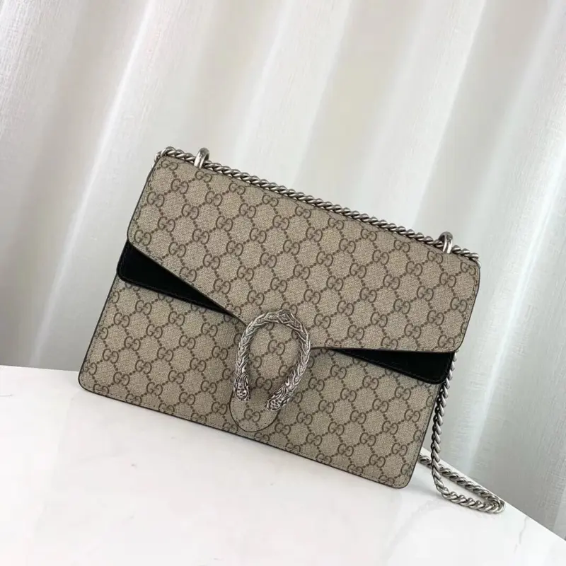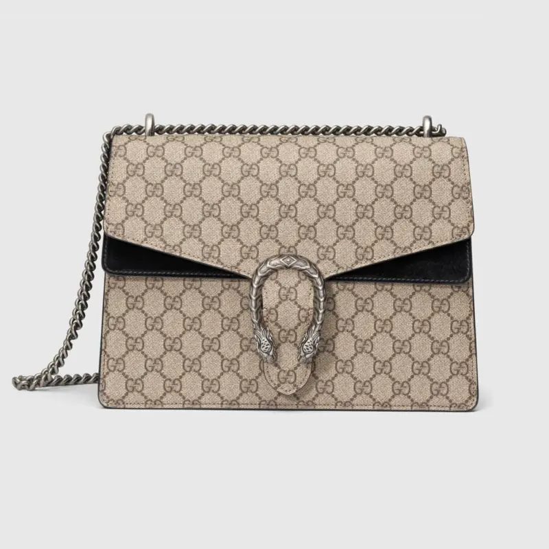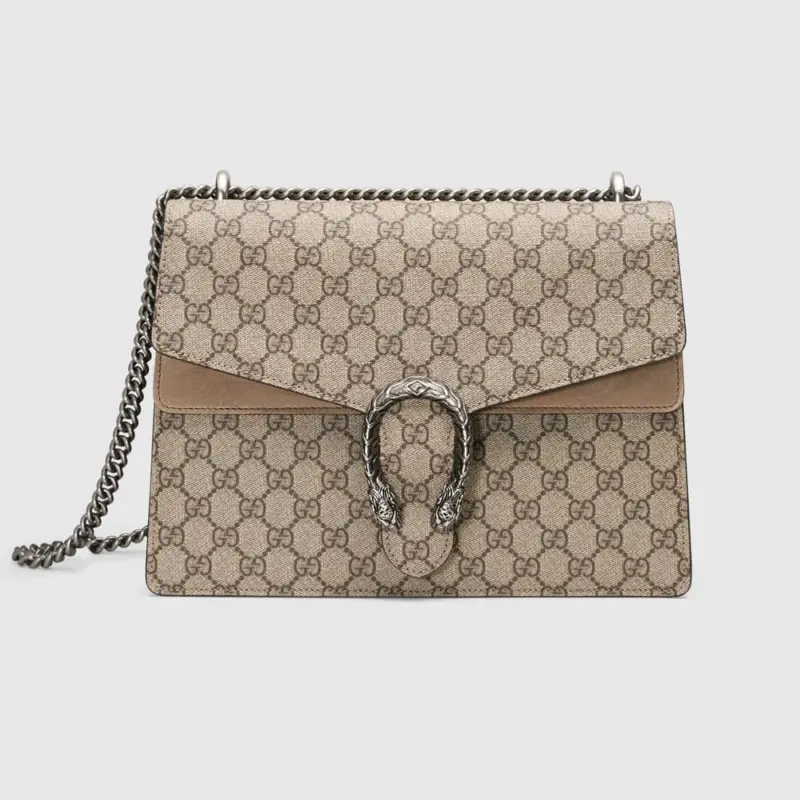 This beautifully structured shoulder bag combines timeless style with modern versatility. Crafted from a durable coated canvas featuring a classic repeating geometric pattern, it’s accented with rich black suede for a touch of luxury. The bag’s most striking feature is its ornate, textured tiger head closure, an element that adds a unique and sophisticated edge.