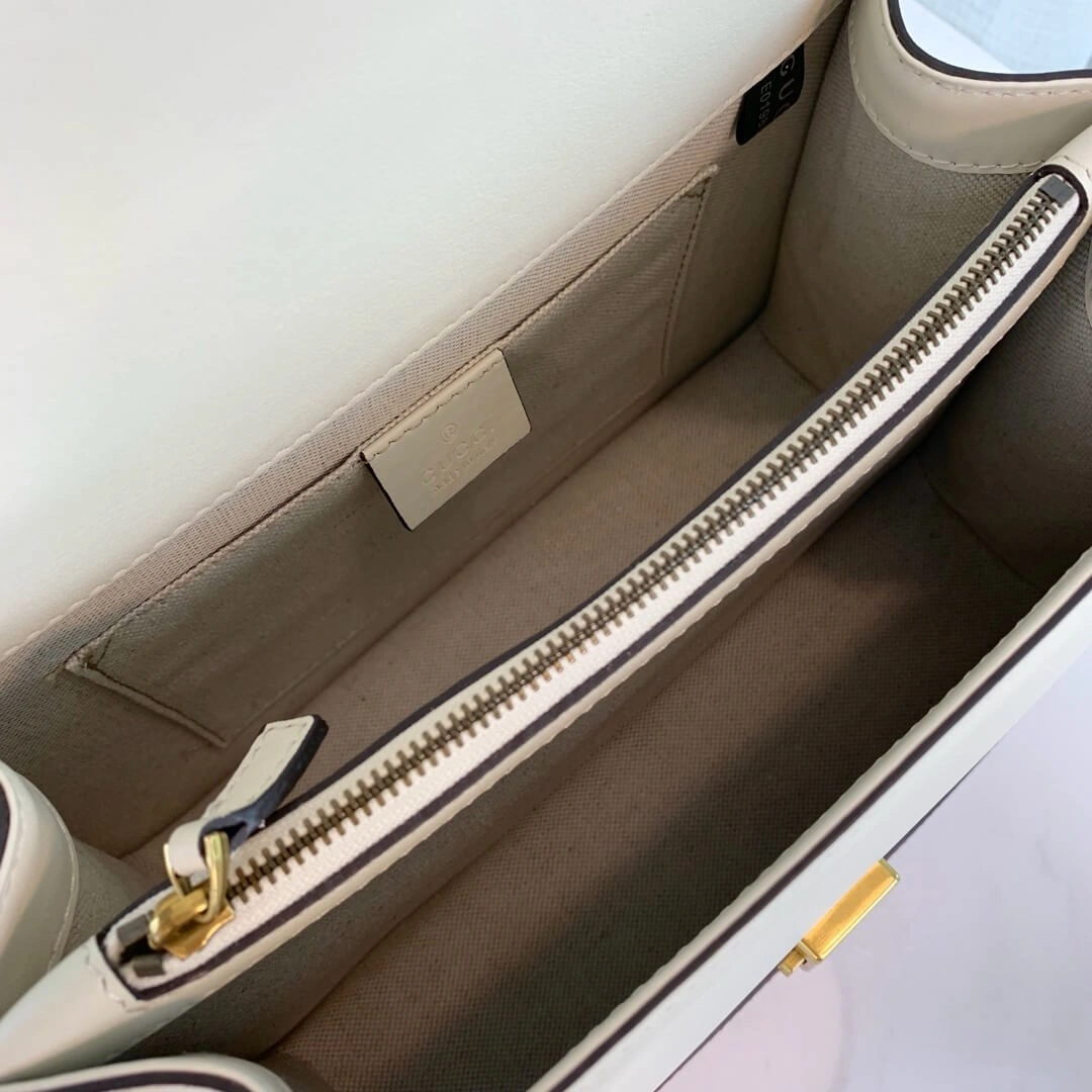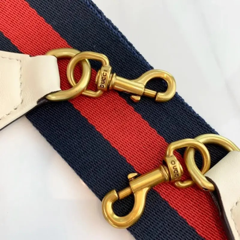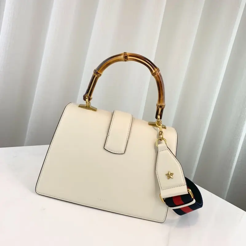 Designed for both style and function, this bag features a distinctive textured clasp in the shape of a tiger head spur. It is equipped with a classic bamboo top handle and a detachable, wide shoulder strap featuring a signature blue and red stripe. The well-organized interior ensures your essentials are always within reach, making it a perfect choice for any occasion.