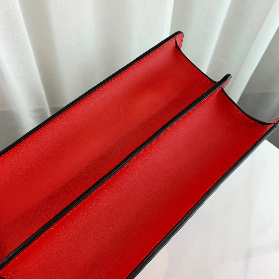 This structured top handle bag offers a sophisticated and timeless design, crafted from fine grain leather known for its softness and subtle shine. The striking tricolor design in red, white, and blue creates a bold, classic look that stands out. A distinctive textured clasp, featuring an ornate, decorative design, serves as the centerpiece of this elegant accessory.