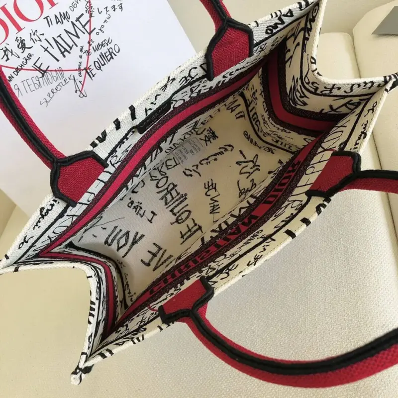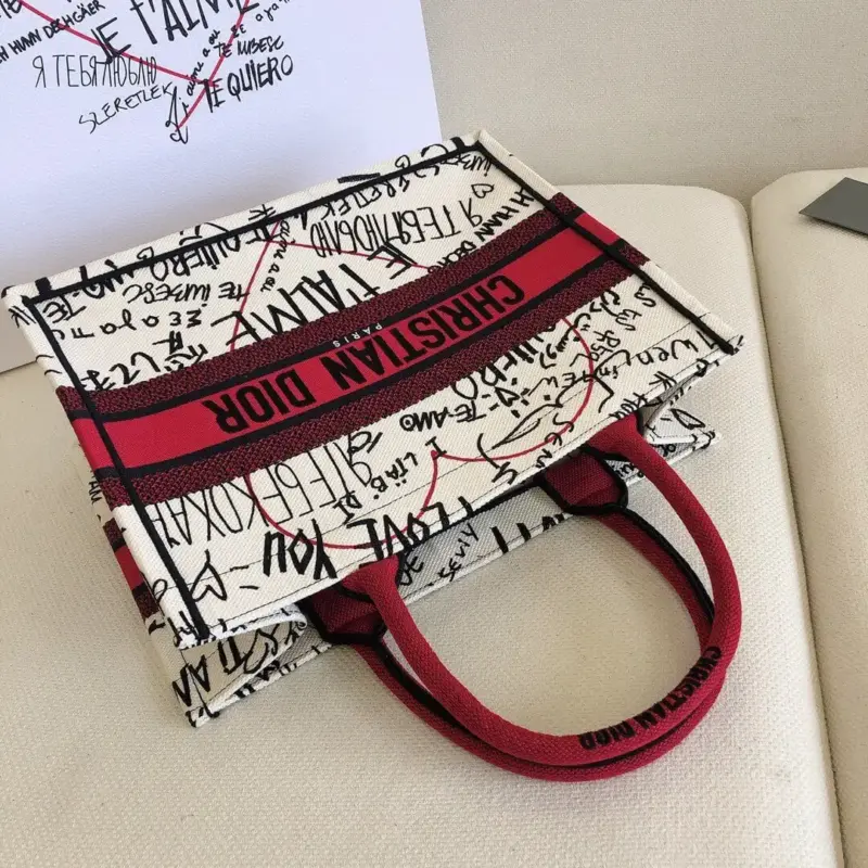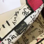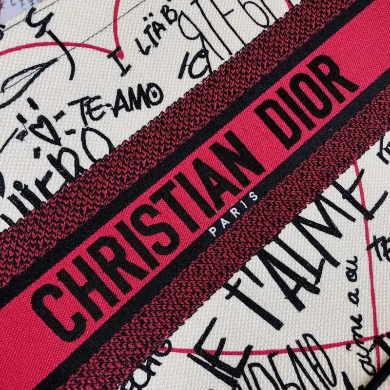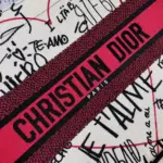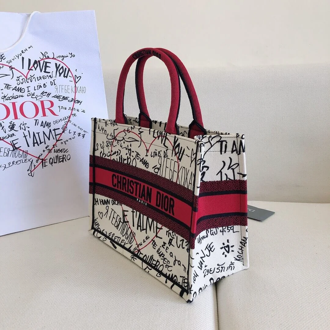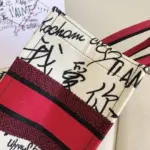 The bag is distinguished by its intricate, all-over embroidery, which creates a vibrant graffiti-style motif. This unique design thoughtfully incorporates the phrase “I love you” in thirty-eight different languages, making it a true statement of affection. A bold, contrasting signature on the front completes this beautifully crafted accessory.