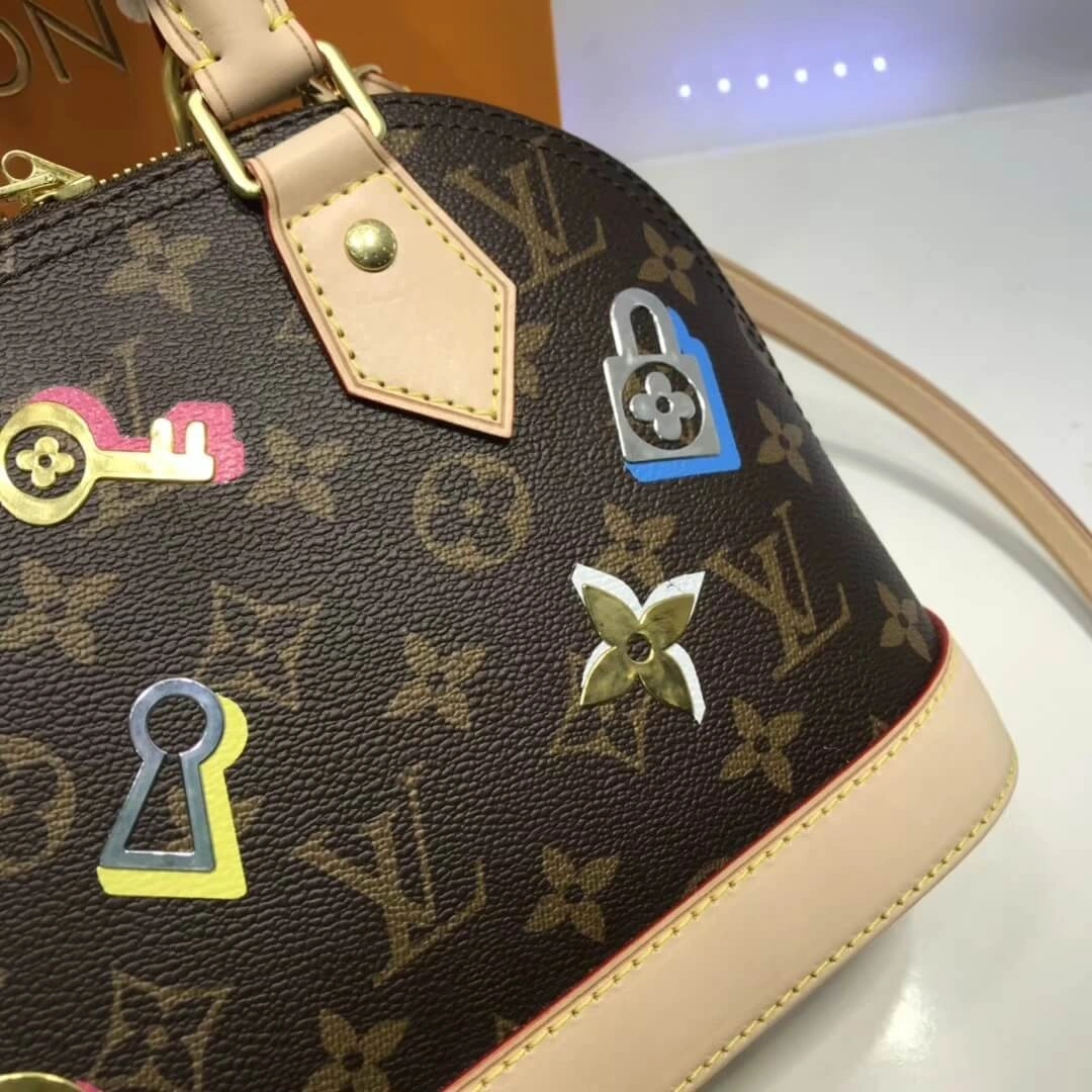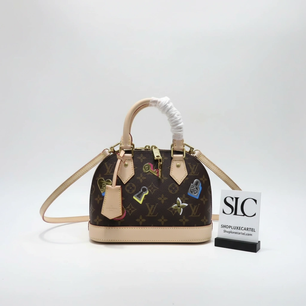 This charming dome satchel offers a delightful blend of classic style and playful romance. The bag is crafted from a durable coated canvas, adorned with a timeless monogram print that is further enhanced by colorful, three-dimensional metallic motifs. These whimsical embellishments, designed to look like locks and keys, are fused to the canvas for a unique, textured effect. Perfect for transitioning from day to evening, this versatile and collectible piece features elegant leather trim and polished, gold-tone hardware.