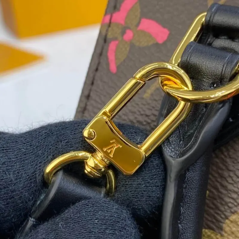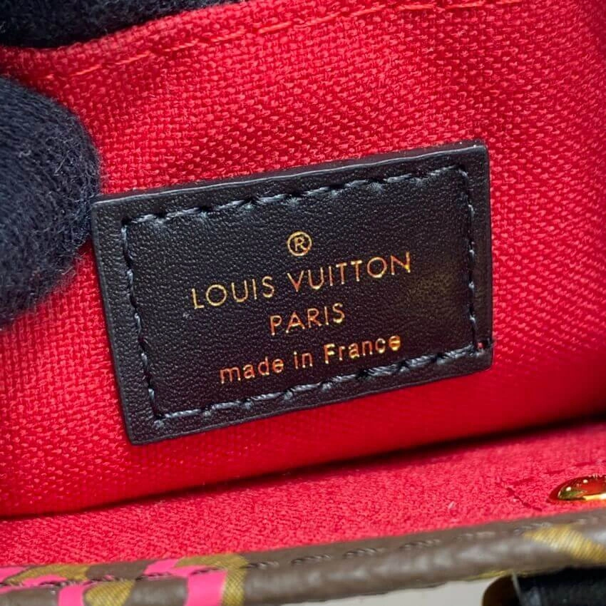 Designed for versatility, this piece includes both dual top handles and a removable strap, allowing it to be carried by hand, worn over the shoulder, or styled as a crossbody. The refined gold-tone hardware and genuine leather trim add a polished finish to this charming and functional accessory.
