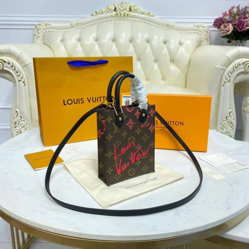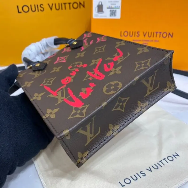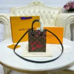 This mini tote bag is a celebrated classic, reimagined with a playful and artistic touch. It features a distinctive, hand-drawn style graphic in a bold lipstick red, printed over a timeless geometric patterned canvas. Its compact, vertical shape offers a surprisingly spacious interior, making it an ideal companion for carrying your daily essentials with effortless style.
