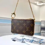 The pouch is elegantly detailed with polished golden-brass hardware, including a secure zipper closure and a refined metallic signature plate. A delicate golden chain enhances its functionality, allowing it to be gracefully carried on the wrist or attached to the D-ring of a larger handbag for easy access.