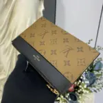 The design features a captivating dual-sided coated canvas, showcasing a classic geometric floral pattern in two complementary color schemes. This striking contrast creates a unique and eye-catching aesthetic. Complemented by smooth leather trim and polished gold-tone hardware, this piece is a testament to refined craftsmanship and timeless design. The main zippered compartment is spacious enough to hold a smartphone, while exterior card slots and pockets provide convenient organization for your essentials.