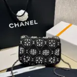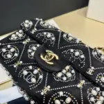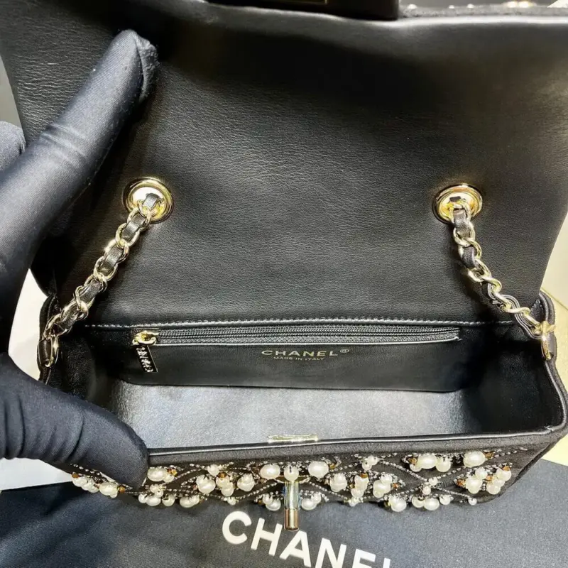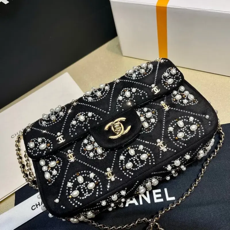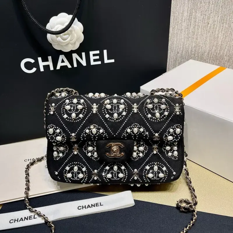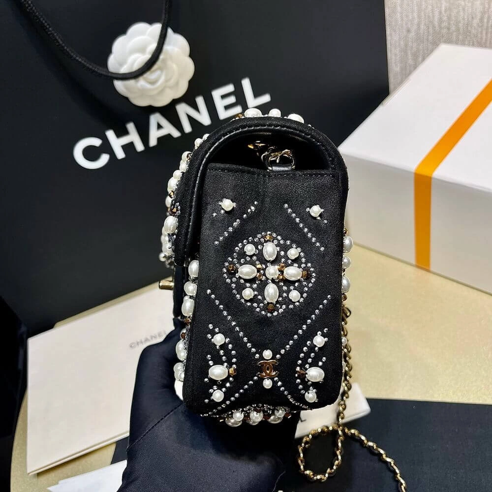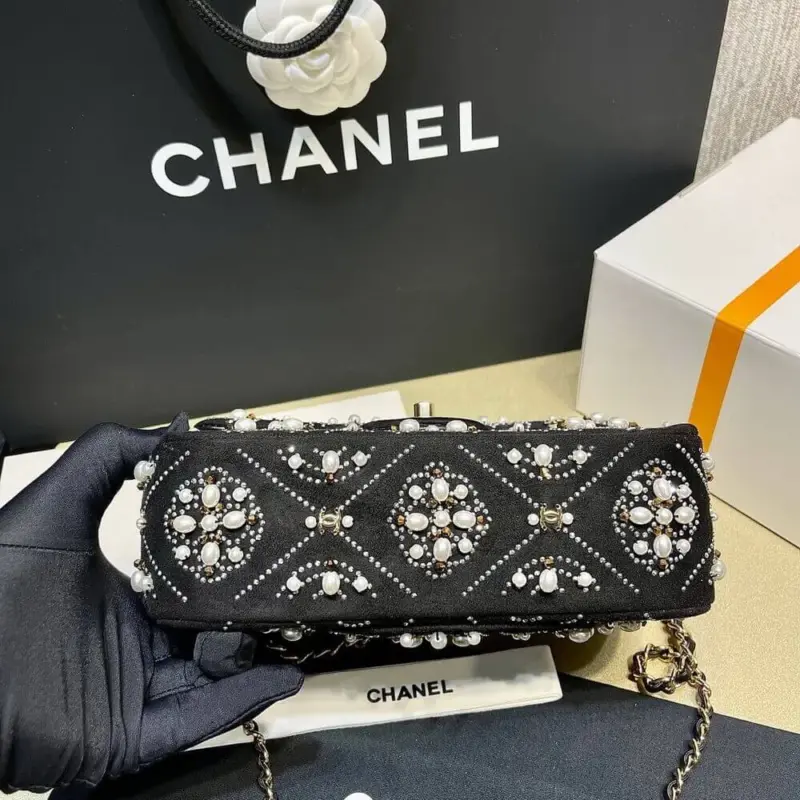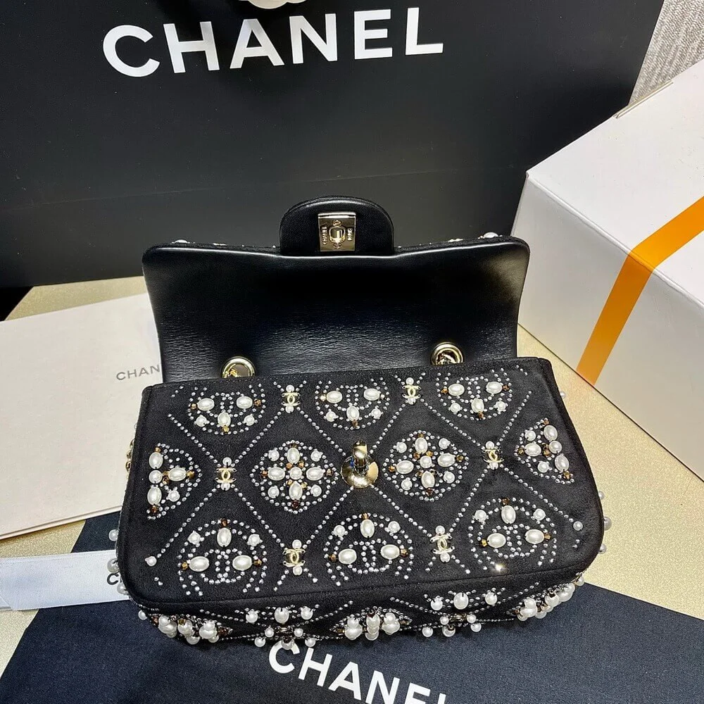 Discover the epitome of evening elegance with this stunning mini flap bag. Crafted from luxurious black quilted velvet, this piece is designed to make a statement. The front flap is lavishly adorned with an intricate arrangement of multi-shaped glass pearls and sparkling crystals, creating a dazzling effect that catches the light beautifully.