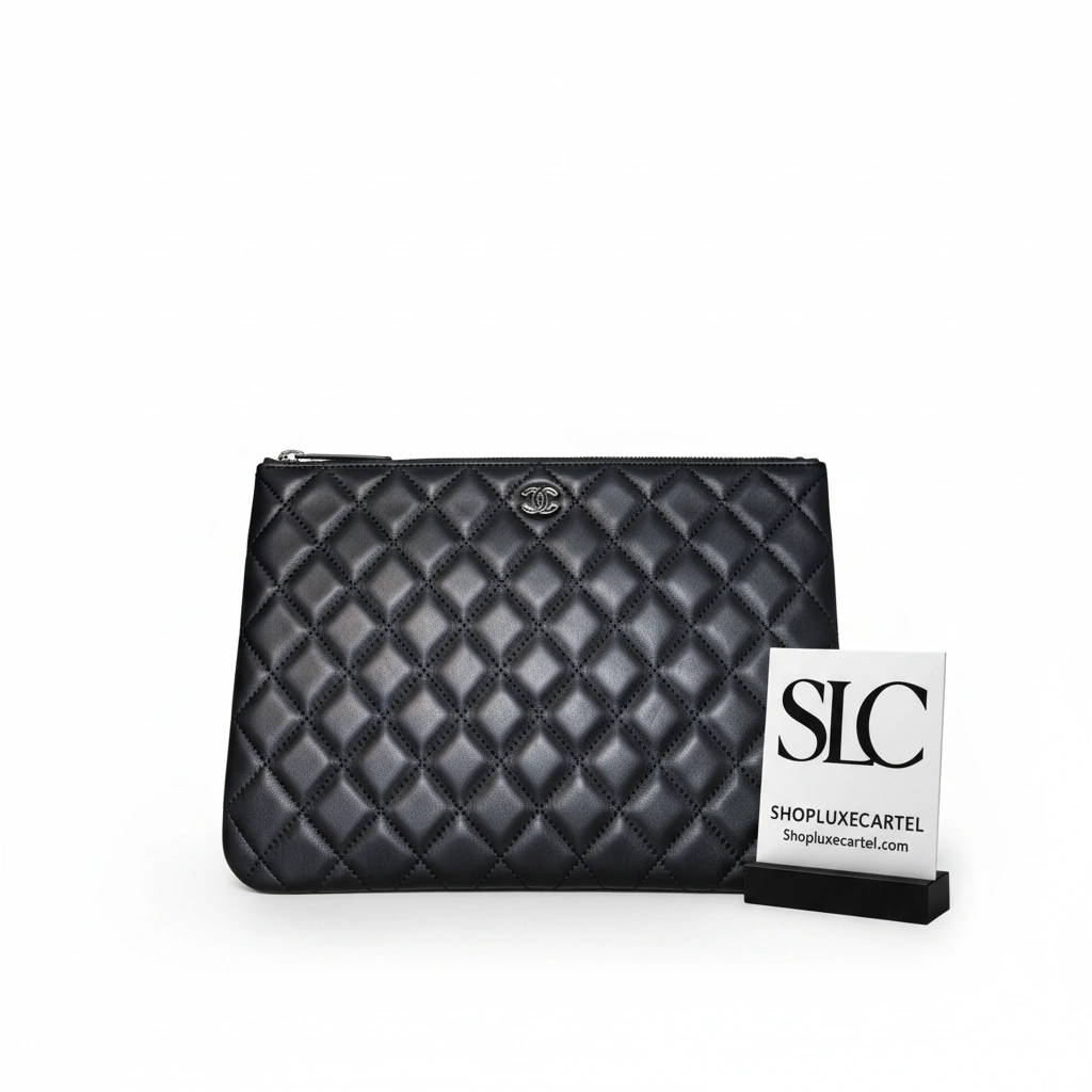 Discover timeless sophistication with this beautifully crafted evening clutch. Made from supple goatskin leather, this bag features a classic quilted design that exudes luxury and elegance. The polished gold-tone hardware, including a distinctive interlocking emblem clasp, adds a touch of glamour, making it the perfect accessory for any formal event or special night out.