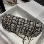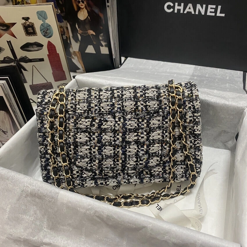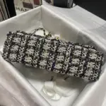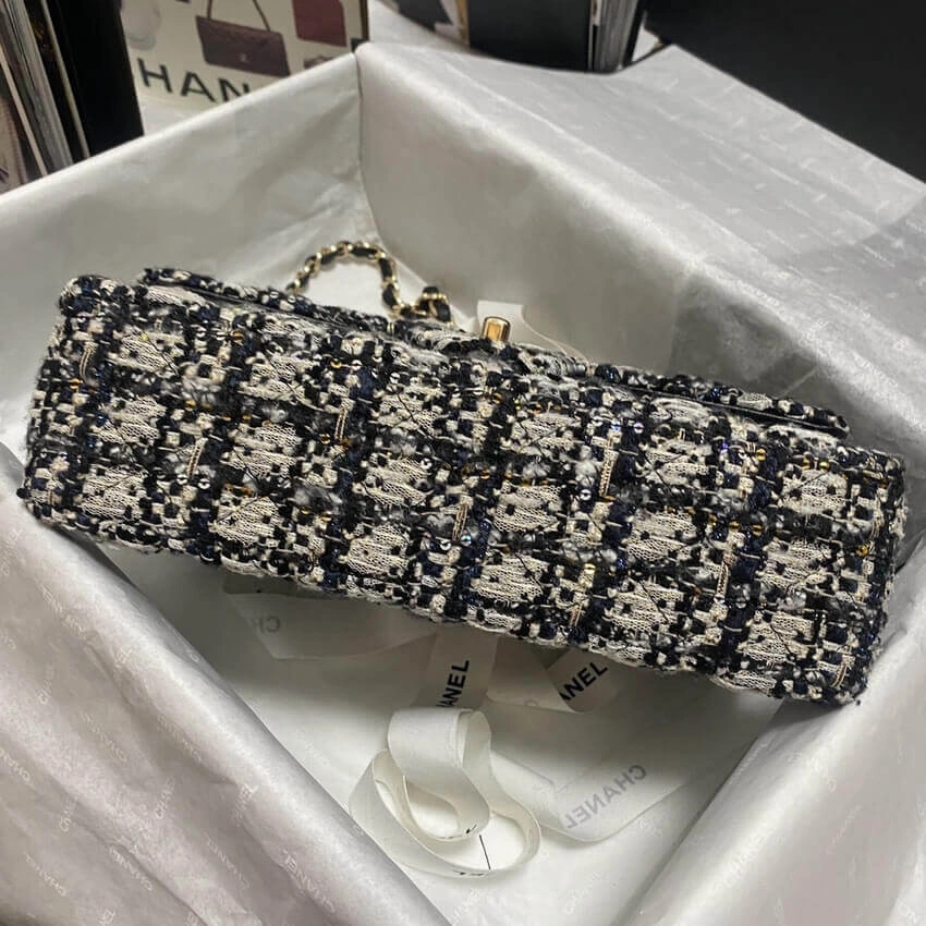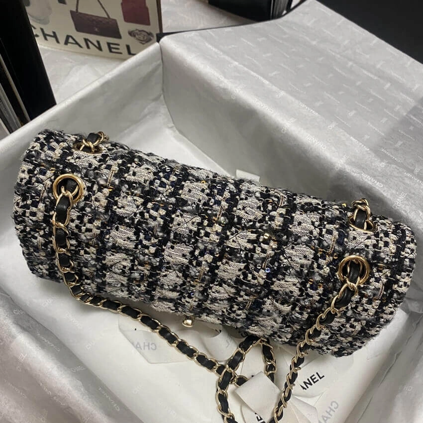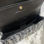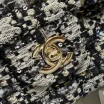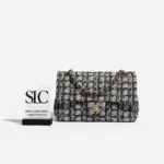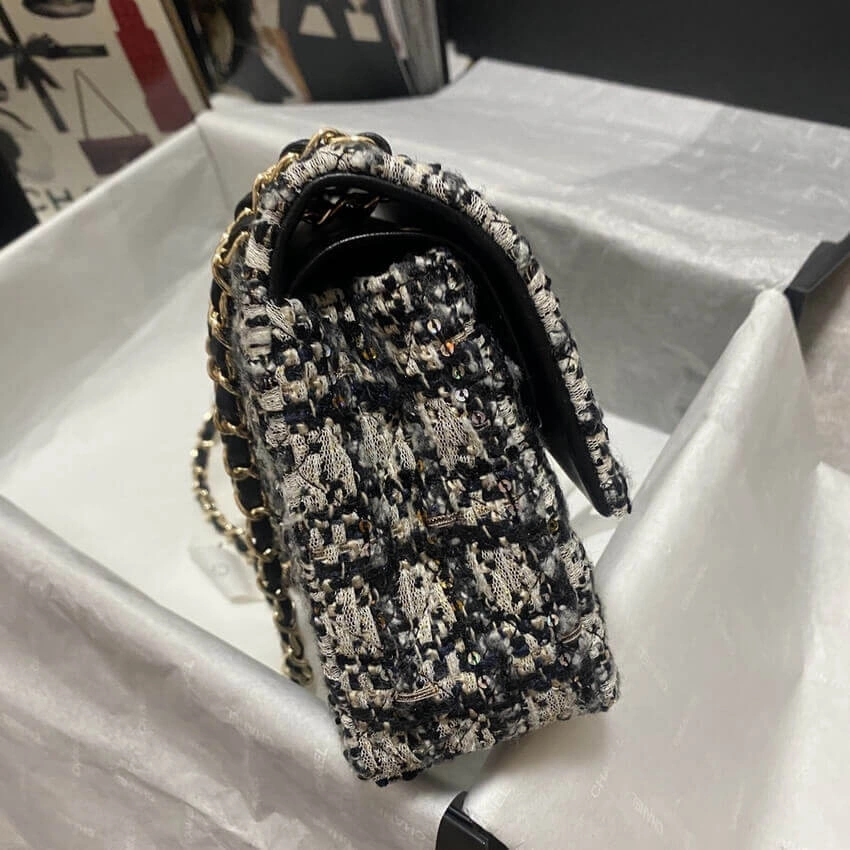 Discover timeless sophistication with this exquisitely crafted shoulder bag. Designed with a classic flap silhouette, this piece features a richly textured, glittered tweed fabric that adds a subtle sparkle to your look. The versatile black and beige colorway ensures it will complement a wide range of outfits, from casual daytime wear to elegant evening attire.